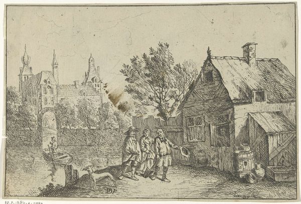 Editor: Here we have Allart van Everdingen's etching, "Swine Herd near a Chapel," dating from around 1645 to 1656. It has a beautifully rendered landscape feel, almost dreamlike due to the sepia-toned print. How do you interpret the juxtaposition of the mundane, represented by the swineherd and pigs, against the backdrop of the chapel? Curator: The image speaks volumes about the sacred and the profane coexisting within the human experience. Notice how the chapel, with its aspiration towards the heavens, doesn't overshadow the earthly reality of the swineherd. What do you think Everdingen is trying to tell us about faith and daily life in 17th-century Netherlands? Editor: Perhaps it's a commentary on the everyday nature of faith, that it exists even in the most commonplace settings? It feels very integrated, not separate. Curator: Precisely! The pig, an animal often associated with base instincts, is brought into the same visual plane as the chapel, suggesting a synthesis. And, look closely – the man guarding the pigs and the other figure further back...consider them symbols representing labour or journeys, alongside religious architecture. It is not a stark division, but rather how cultural symbols evolve and mingle with the routines of the time. The etching method gives it an old-world texture too. Does that invoke anything for you? Editor: Yes, that’s fascinating! I hadn’t considered the cultural significance. It lends the image a sense of timelessness, yet it's firmly rooted in its own period. Thank you, this changes everything for me. Curator: The joy is in seeing the world afresh. Every line etched here is a window into a world that shaped our own.