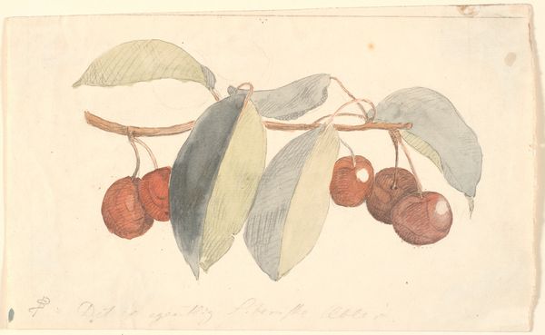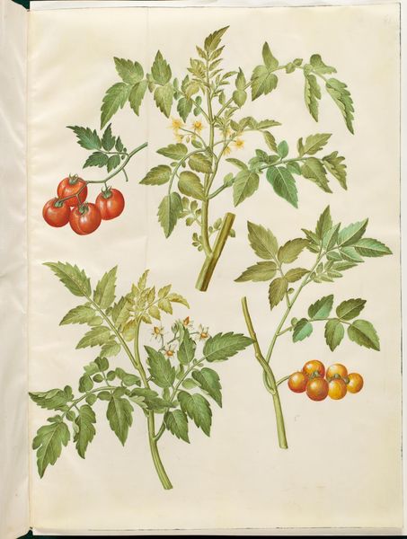 Curator: Before us, we have “Nialel,” a drawing likely made between 1678 and 1703, part of a larger compendium assembled by Hendrik Adriaan van Rheede tot Drakenstein. It combines watercolor and print on paper. Editor: The clusters of berries are so densely packed, a little ominous actually. They almost feel like… watchful eyes, punctuated by those delicate blue blossoms, like scattered thoughts around the central mass. Curator: Consider the material conditions of its production. Botanical illustrations like this one weren't simply artistic endeavors. Van Rheede was commissioned by the Dutch East India Company. Knowledge about plants, particularly medicinal ones, was crucial for trade and colonial administration. Labor was organized to render flora with utmost accuracy and that involved both local and European artisans. Editor: The different languages noted reflect a complex web of exchange. I’m drawn to how the image seems to embody a cross-cultural moment. This specific plant and artistic languages meet. "Nialel," even the title, it's layered with possible meanings, now lost in time. Curator: Indeed. The very act of recording this plant transformed it into a commodity, or potential commodity. Paper, ink, watercolors, even the artists themselves, were resources employed to further imperial ambitions. And let's not forget the networks that disseminated these images, spreading both knowledge and power. Editor: Yet, even knowing all that, I can’t help but see something almost spiritual in the precision. The image-maker carefully captured each vein of every leaf. These weren’t sterile documents, but renderings imbued with respect, wouldn’t you say? Almost as though there's a reverence for nature… a tiny hint of a secret language between the illustrator and their muse. Curator: It is easy to impose romantic interpretations in hindsight. It is important to remember this drawing, and other artistic objects from the colonial era are inherently products of extraction and exploitation, no matter how much care went into rendering a stem, or berry. Editor: A point well taken. But looking closely also allows to see that art is the enduring mark left by even unequal dialogues between civilizations, long after the trade deals are concluded, wouldn't you agree?