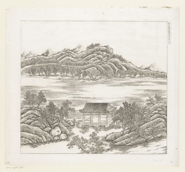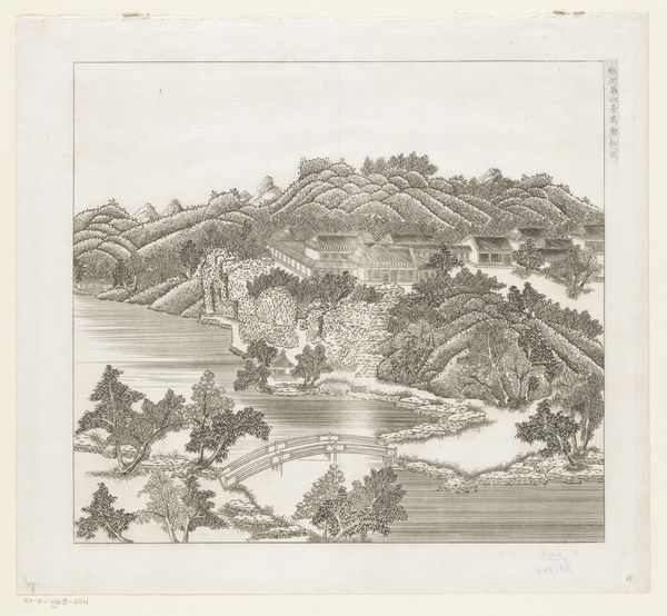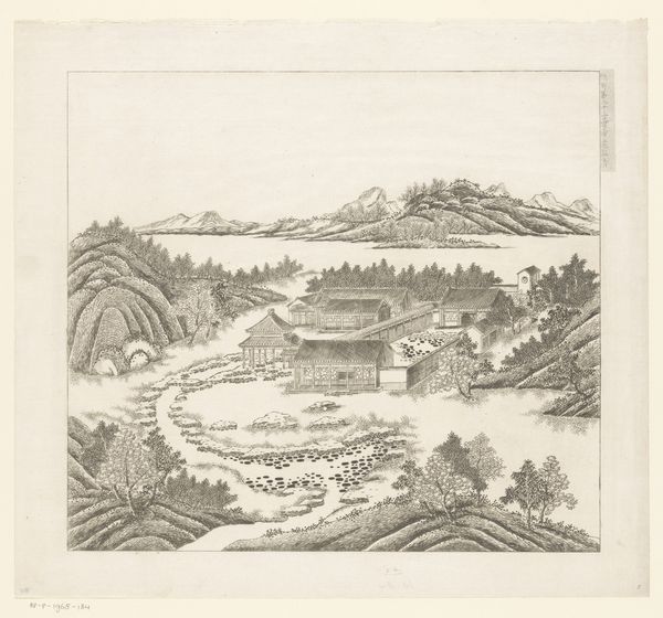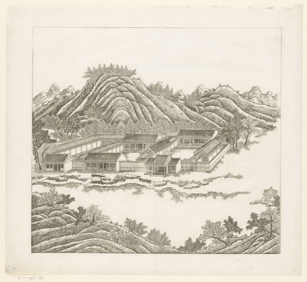Curator: This delicate ink and paper drawing is titled "View of a Part of the Imperial Summer Palace in Chengde (Jehol) in China." It was created between 1712 and 1714 by Matteo Ripa. Editor: My initial reaction is one of serenity; there's a sense of balance between the architecture and the natural elements. The artist uses very fine lines, creating this aerial perspective, that makes it almost seem like a memory, or a vision. Curator: That sense of memory resonates, I think, with Ripa's positionality. He was an Italian missionary in the court of the Kangxi Emperor. This image, along with others he produced, played a crucial role in shaping European perceptions of China and, particularly, the imperial lifestyle. It served almost as a form of visual diplomacy. Editor: Looking closer at the composition, I am drawn to how Ripa frames the palace with the rolling hills in the background. The dark ink creates areas of high contrast, particularly with those densely drawn mountains. They really serve to anchor the lightness and almost ephemeral qualities of the palace itself. Curator: Absolutely. And we need to consider the implications of how these landscapes were being received in Europe at the time. Ripa was intentionally depicting the power and sophistication of the Chinese court for a European audience still largely unfamiliar with its complexities. This image reflects both his experience within that world, as well as his understanding of the visual rhetoric that would most impress audiences back home. Editor: Right, but his rendering is not photorealistic, and that lack of precise detailing directs the gaze and, indeed, constructs an idea more than conveying a specific truth. You mentioned the purpose, the intent of visual diplomacy, which means the artistic rendering becomes very persuasive. Curator: Precisely, and ultimately invites reflection on the exchange of ideas between different cultures, especially considering power dynamics in artistic depictions and the ongoing legacy they imprint on understanding history. Editor: And for me, the quiet intricacy and layering, with subtle tonal graduations, remind us of the enduring power of drawing to simplify, distill, and convey a whole world in just a few essential elements.