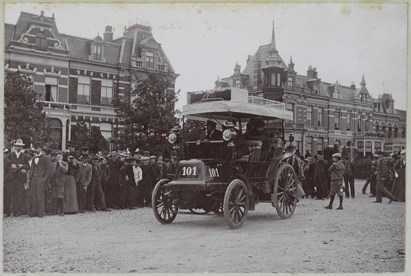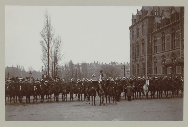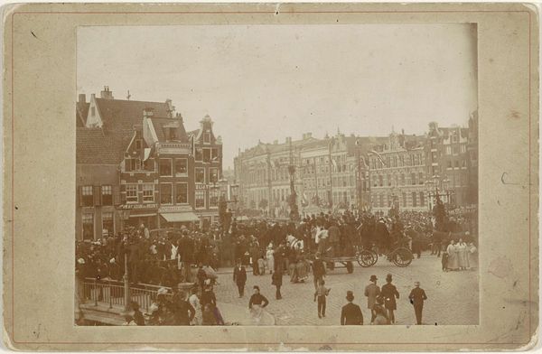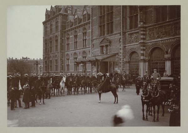 Curator: This albumen print by Albert Greiner captures a specific historical moment: the inauguration of Queen Wilhelmina in front of the Rijksmuseum in 1898. What strikes you about it? Editor: Immediately, I'm drawn to the mood. There's an air of anticipation, but also formality and distance. The tones are quite muted; it has a sort of sepia wash. I think it reinforces the idea of royalty—something apart. Curator: I agree, that sepia tone links it back to the older photographic traditions but here serves to mythologize this relatively young queen's symbolic importance for the kingdom. The photographic image creates a cultural artifact imbued with that importance, connecting her to a longer lineage of national identity. The muted color enhances that historical feel. Editor: It's interesting to think about photography, even then, shaping public perception and manufacturing this kind of regal image. Look at the architecture of the Rijksmuseum in the backdrop, solid, imposing – it reinforces power. Then notice the way the crowd is arranged. So many anonymous male figures facing forward. Where are the women? Where's the diversity? Curator: Those rigid lines of men are so evocative of the strictures and conventions of that time. I see a city eager to publicly show support of a female head of state. They signify a kind of "old guard," reinforcing this established order which depends on their obedience and orderliness. This sea of similar faces may reinforce a national identity more than reflecting lived realities. Editor: Precisely, and it becomes clear why the photographer frames the Queen from a distance, highlighting that divide and the construction of hierarchy. A staged event captured with what seems to be no chance for real agency of the general public. Curator: Despite this sense of formality, that very visibility granted a sort of access. Photography served to disseminate the image of the monarchy in unprecedented ways, creating new visual narratives for people to interpret. The carefully placed iconography may indeed support order, but also allows more complex ideas of sovereignty and civic pride. Editor: True. I keep thinking about visibility here, the way access has changed or *not* over time. These photographs once circulated amongst particular social echelons while being actively suppressed in others, shaping public discourse in biased ways. It’s a glimpse into the curated reality of that era. Curator: This is something that visual symbols continuously accomplish, isn’t it? Showing one aspect, and, even through their presence, hinting at everything unseen. Editor: I agree, understanding that helps me connect a seemingly straightforward historical photograph with our modern visual landscape.