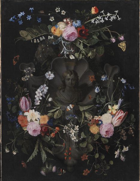 Curator: Here we have Maria van Oosterwijck’s "Bouquet of Flowers in a Glass Vase," created around 1685. It’s an oil painting on canvas, currently housed in the Statens Museum for Kunst. The darkness is quite striking, isn't it? Almost oppressive. Editor: Yes, the tenebrism creates a dramatic contrast. The bouquet seems to emerge from a void, grabbing the viewer's attention immediately. Curator: Absolutely. Note how Van Oosterwijck meticulously renders each petal, each leaf. It’s a marvel of technical skill, especially when you consider the intricacies of light and shadow in the Baroque style. We can really see the tangible form of the objects portrayed here, a real command of light and form. Editor: Indeed. But it's not just a demonstration of skill. During the Dutch Golden Age, flower paintings, particularly those executed by female artists, can be interpreted within a context of limited roles and societal expectations. Floral still lifes allowed for creativity, agency and an engagement with science. The selection of each flower is a possible symbolic representation, hinting at moral and political considerations for the viewer. Curator: An interesting thought. Do you see something particular about *these* flowers that implies symbolism? Editor: Given the presence of certain flowers alongside the decaying wheat and what looks like dead moths, it all gives off a Vanitas mood, reflecting on beauty’s fleeting nature. Oosterwijck also remained unmarried throughout her life, and while we can only speculate, it's important to recognize how patriarchal forces defined women in relation to their husbands during this time. How do we view Oosterwijck's achievements when considering social constructs? Curator: Fascinating. Still, I am mesmerized by her manipulation of texture, and in purely formal terms, there is the delicate balance created, as well as how the light creates gradations of shadow in a calculated composition, and her work here remains exquisite whether read in her era, or today. Editor: Indeed, it bridges both, doesn't it? From a technical mastery and display of observation, to opening questions of women's social mobility during a certain timeframe. Art reflects our own time period.