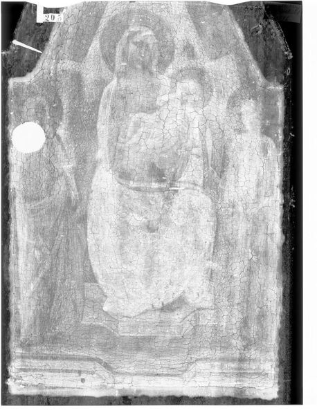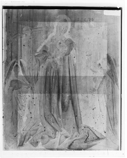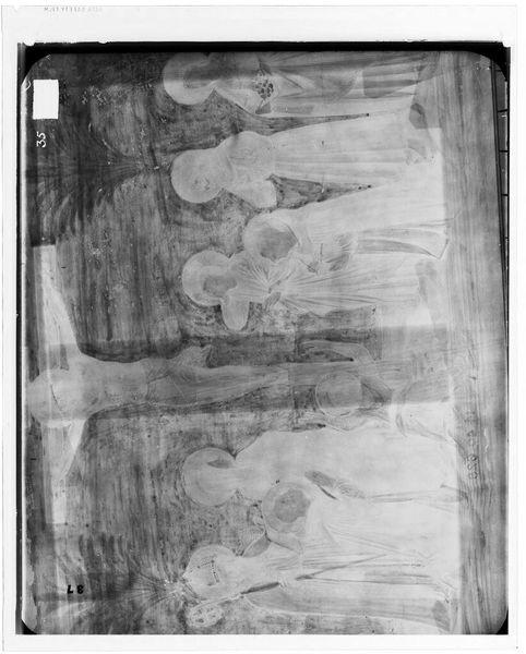 Curator: This is an X-radiograph of the "Crucifixion," attributed to Spinello Aretino, currently residing in the Harvard Art Museums. Its film size measures 14 by 17 inches. Editor: Wow, it’s ghostly, like looking at a memory. The figures emerge and fade, and that central figure… it’s heavy, despite its ethereal quality. Curator: The X-radiograph allows us to see beneath the surface, revealing the artist's process and the layers of material used. It's fascinating to consider the labor involved in creating the original. Editor: And the emotional labor, too! To repeatedly render the same scene is an art itself, isn't it? Curator: Absolutely. It challenges our notions of originality and craftsmanship. Editor: Yes, what is concealed behind that surface can tell a story of its own. Curator: Indeed, a narrative of production itself. Editor: It’s a raw glimpse of something sacred.