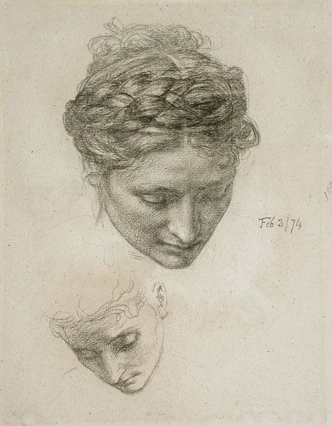 Editor: So this is a pencil and charcoal drawing by Johann Peter Krafft, titled 'Kopfstudie zu 'Arindal und Daura'," made sometime between 1820 and 1855. There’s a softness to it, but also an intensity in the woman's expression. What catches your eye in this piece? Curator: Considering the era, and the title, I'm interested in the possible literary source, maybe a play or novel depicting historical figures. Krafft might have been contributing to the visual culture surrounding these romanticized narratives. What kind of social circles were engaging with "Arindal und Daura" during that period, and how did images like this circulate among them? Editor: I don't know anything about 'Arindal und Daura' . It feels like a preparatory study rather than a finished, public-facing work. Are you suggesting the political impact lies in representing that story? Curator: Yes, it’s probably a study, but I don’t want to dismiss the agency it has. In its time it could be seen and understood as referencing cultural, social or even political ideals through dramatic imagery. If “Arindal und Daura” represents, for instance, heroism or resistance to oppression, then this study contributes to that representation. We can think about where art intersects with other aspects of culture and lived experiences. How were stories, characters and images spread among audiences? Editor: I see what you mean. Even a sketch can reinforce existing cultural narratives. It makes me think about how images, even preliminary ones, always participate in a wider conversation, socially. I need to dig into "Arindal und Daura" myself. Curator: Exactly. And by examining these 'minor' works, we get a clearer picture of how the bigger ones were perceived, which ones resonated with contemporary viewers and critics, and why.