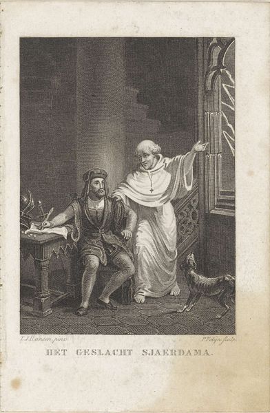 Curator: Here we have "Bewoners van Egypte," or "Inhabitants of Egypt," a print created around 1807 by Ludwig Gottlieb Portman. What jumps out at you when you first see it? Editor: An immediate sense of voyeurism. The cool palette seems at odds with what I imagine the harsh Egyptian sunlight to be. There's a palpable distance, a sense of observing rather than experiencing. Curator: Portman wasn’t actually an eyewitness; these images often relied on second-hand accounts, feeding a European fascination with the 'exotic' East. The work is actually an engraving. It's incredibly detailed for the medium. Editor: And laden with orientalist tropes, wouldn't you say? The woman, veiled, almost secondary to the man and his elaborate pipe. It speaks to power dynamics, who gets to be seen, who gets to partake in leisure. Curator: Absolutely, and notice the background; the architecture is stylized, almost theatrical, creating a sense of stagecraft more than genuine portrayal. The longer I look, the more artificial it seems, as though constructed for European consumption. Editor: I'm struck by the clothing, so carefully rendered, highlighting differences and, ultimately, "othering". The details invite viewers to inspect, to dissect, turning the people into objects of study. What do you suppose it tells us about the period in which it was made? Curator: It shows the beginning of the Romantic period. Even while claiming scientific curiosity, art served to underline colonial ideologies. The artist had control over this unknown subject that the average Western European viewer would likely know nothing about. And the contrast with modern Egypt could not be any sharper, no matter your perceptions. Editor: A powerful point to end on, really, how artworks can reflect and shape perceptions across vast distances of space and time, highlighting historical context. Curator: It certainly gives us a lot to chew on and contemplate.