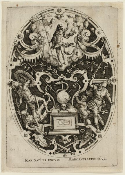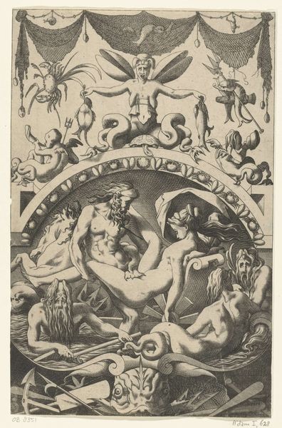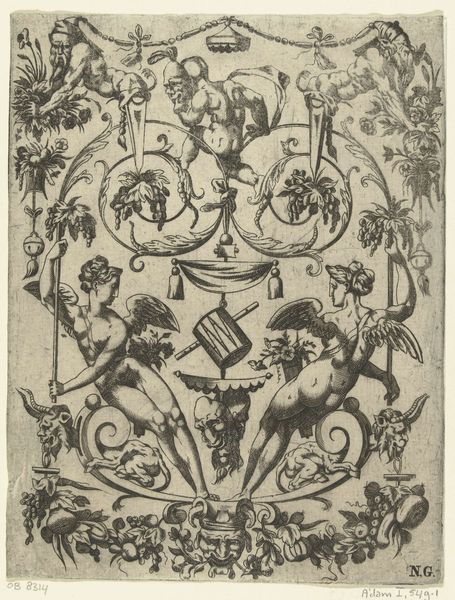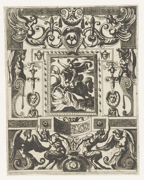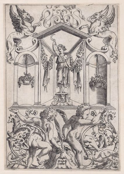 This print was made by Johannes van Doetecum I in the late 16th century, using engraving on paper. The process involves incising lines into a metal plate, applying ink, and then pressing paper against the plate to transfer the image. Look closely, and you’ll see the print is teeming with figures and ornamentation. Its density is a direct consequence of the engraver's craft, which allows for incredibly fine detail. This is a work intended for the decoration of luxury goods, or perhaps to inspire architecture. Notice the niche under the canopy. This is a design that’s meant to give a patron ideas, impressing them with a vision of wealth and sophistication. The print is part of a larger book of designs, reflecting the rise of print culture at this time. Van Doetecum was not just an artist, but also a kind of factory. His workshop mass-produced images, meeting the growing demand for accessible and affordable art. This kind of printmaking played a crucial role in shaping our very ideas about creativity and commerce.