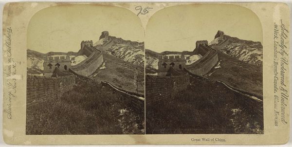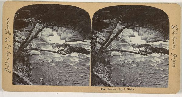 Editor: This stereograph, titled "Saratoga Springs and Vicinity," dates back to about 1860 and is credited to C. W. Woodward. It's a sepia-toned photograph of a rock spring, probably High Rock Spring according to the inscription. It has such a geological presence. What do you see in this piece from a materialist perspective? Curator: The real fascination lies in the means of its production and consumption, doesn't it? This wasn’t simply a landscape photo; the stereograph format was key. Consider the rise of leisure travel at the time, and Saratoga Springs’ popularity as a resort. Editor: A form of early tourism advertisement, you mean? Curator: Exactly. And think about the materiality: albumen prints, mounted on card stock. It was mass-produced, yet each one still relies on specific, hands-on photographic and printing processes, requiring darkrooms and the specialized knowledge for its creation. How does this compare to a traditionally “high art” like painting or sculpture in your opinion? Editor: Well, there's a sense of immediate accessibility that painting might lack; this photograph documents and makes accessible an existing feature to a much broader population than if Woodward had painted the site. Curator: Precisely! The rise of photography democratized image-making, challenging the elite status of traditional art forms and opening it to the working class and emergent tourist economies. It reminds us to consider who profits from this type of work. Editor: That gives me a totally different perspective! The photographic material and format are just as significant as the subject in telling the story of this historical site. Thanks! Curator: Absolutely! Understanding art involves digging beneath the surface of an image and grappling with broader socioeconomic considerations of art and labor, who owned it, how it circulated and who were its intended audiences!