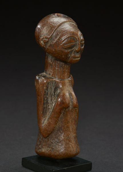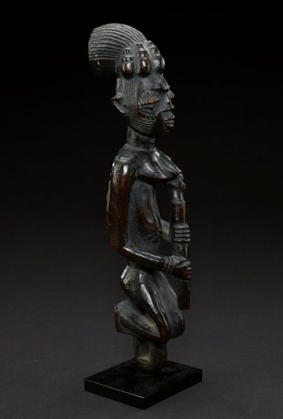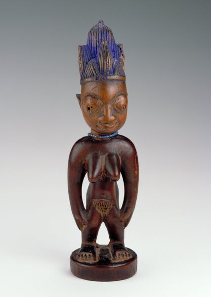 This 'Standing male figure' was carved in an unknown year by an anonymous Yoruba artist. The color is subtle here, and yet it’s also saying something, this warm brown that's been built up, layer by layer. It's almost like the artist is coaxing the figure out of the wood, letting the material itself guide the way. Look at how the texture shifts across the surface, from the smoother planes of the chest to the more articulated details of the face and the interesting blue conical hat. There's a real sense of touch in every mark, a kind of responsiveness to the material. See how the figure holds his hands together, there’s a real sense of something internal going on here, a kind of quiet confidence or contemplation. It reminds me a little of some of the early Cycladic figures, this sense of pared-down form and essential presence. Ultimately, it’s a piece that invites slow looking, a kind of visual meditation on form, material, and the human condition.