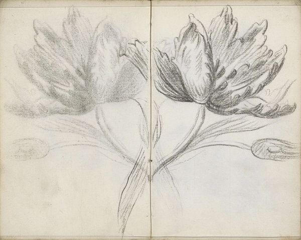 Curator: At first glance, there’s a quiet serenity to this work. Almost austere, even in its depiction of flowers. Editor: That’s a wonderful observation. What we have here is "Studieblad met een roos en een ranonkel (?)," or “Study Sheet with a Rose and a Buttercup (?)”, made sometime between 1683 and 1733. It is currently held here at the Rijksmuseum. The artist, Bernard Picart, used pencil and pen to create this lovely drawing. Curator: The rose, particularly, carries such weight. We associate it with love, passion, and even secrecy—think of "sub rosa," beneath the rose. Yet, in this sketch, its presentation is quite subdued, wouldn’t you agree? Editor: Indeed. The delicate strokes seem to whisper, not shout. During this period, flower studies gained prominence. They served not only as artistic exercises but also as scientific records, and the development of printmaking allowed their circulation to a wider audience. This piece, I think, straddles that line, balancing artistic beauty with a botanical curiosity. Curator: It’s interesting that you mention its scientific role. Even the format hints at that function—a study sheet of flowers, where academic art merged with the budding interest in botany and classification. How intriguing to see art playing a role in cataloging the natural world! Editor: Absolutely! There's something poignant about these sketches surviving across centuries. We glimpse Picart's close study, the precise lines attempting to capture nature’s fleeting beauty. Roses have appeared in religious art too. Curator: True, as symbols of the Virgin Mary. But here, it feels stripped down, doesn't it? The focus shifts away from pure allegory toward something more observational, less burdened by symbolism and more intent on observing reality. Editor: Ultimately, it is about layers isn't it? We, today, bring all the associations we have of art’s societal roles. Picart brings the tools that shaped how his contemporaries saw and engaged with the image. A subtle dialogue across centuries. Curator: Precisely, these sketches serve as an art historical lesson in evolving viewership of artwork! Editor: And, of the endless ability for imagery to remain ever so poignant.