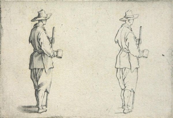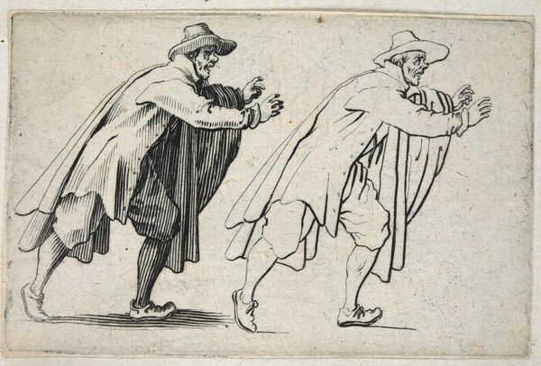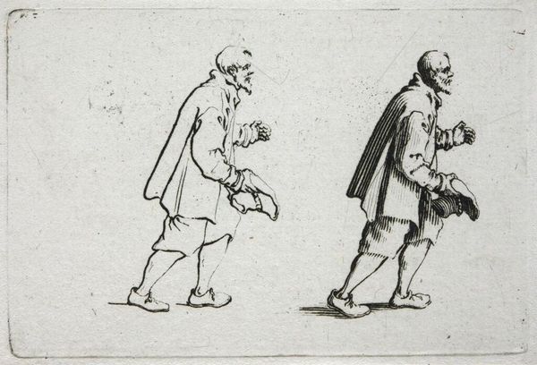 Editor: Here we see Jacques Callot's "Man Running," a small etching. The stark lines and diminutive size make the frantic energy of the figure even more compelling. What stands out to you in terms of the composition? Curator: The artist’s employment of line is quite striking. Observe how the density of etched lines around the figure on the right creates a sense of depth and volume, contrasting with the lighter, more diagrammatic rendering of the figure to the left. How does this contrast affect your reading of the work? Editor: It's like a before and after, or maybe a study in motion. It is interesting to consider how the lines change the reading of depth. I will be looking at Callot's prints in a new way. Curator: Indeed, the formal elements guide us to a richer understanding of the artist's intention.