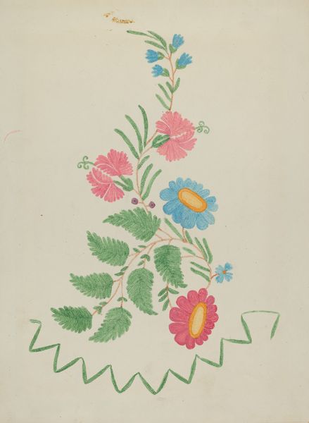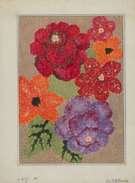 Curator: Looking at this piece, it evokes for me a very comforting domesticity. Editor: It absolutely does. I am drawn to this work for its palpable sense of handmade charm. The “Hooked Rug,” dating back to about 1936, by Ruth M. Barnes, uses a mix of media and textile to create, as you said, Curator, something almost maternal. It feels like a cherished object that one might find in a cozy cottage or farmhouse. Curator: Precisely. Rug hooking itself has deep roots in resourcefulness. Traditionally, women repurposed scraps of fabric, giving humble materials a new, beautiful, and functional life. Consider the cultural memory embedded in those fibers. Each snippet might carry a story, a memento of clothes worn, or remnants of a loved one’s belongings. Editor: Yes, I'm particularly struck by the kind of joyous naivety of the floral arrangement. It is bursting with vibrant reds, blues, and pinks against this, as you mentioned, resourceful background. I love the tension there. The composition is dense, almost overflowing, creating an atmosphere of abundance, maybe even folksy optimism? Curator: I appreciate your observation regarding its density. Folk art, generally speaking, is rarely minimalist, wouldn't you agree? In many traditions, abundance symbolizes prosperity and good fortune, as if warding off potential want. It taps into that part of the collective unconscious. The symbol-making apparatus just doesn't quit. Editor: The brown background acts like a stage; it simultaneously anchors the piece and lets the colors pop, in the purest definition of Regionalism and Naive Art. Did anyone try to do that in fine art in those days? It speaks to the democratization of creativity – everyone has something beautiful to offer from their experience and their surroundings. Curator: Exactly! That is the enduring allure of this piece. In contrast to abstract art movements brewing elsewhere at the time, regionalist work centers upon the intimate and identifiable as both its means and subject. It tells the quiet but insistent stories of the ordinary people whose symbols form its visual vocabulary. Editor: Thanks for pointing that out, Curator. Looking at this Hooked Rug again, it's not just decorative; it’s a portal. It links us back to the hands that created it and, I think, a shared human impulse to make, and to make beautifully. Curator: And to cherish the everyday. The stories interwoven within these textiles provide enduring warmth.