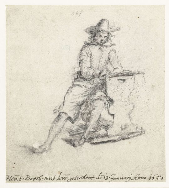 This quick sketch of a soldier, seen from the back, was made by Harmen ter Borch around 1669. The figure is shown in simplified forms, with a sweeping hat and a visible sword at his side, which speaks to the period's militaristic culture. The presence of the sword is an ancient symbol, recurring across cultures from the Bronze Age to modern times. This weapon signifies authority, defense, and often, justice. Think of the archangel Michael wielding his flaming sword, or the countless heroes throughout history depicted with their blades, announcing power, protection, and the readiness to act. The soldier, in this light, transcends his immediate representation to symbolize deeper, collective notions of defense and valor. The drawing resonates with our innate understanding of the psychological role of such figures in society, evoking a sense of security but also, potentially, of conflict and aggression. The sword and the soldier are symbols that resurface continuously, evolving yet retaining their core essence.