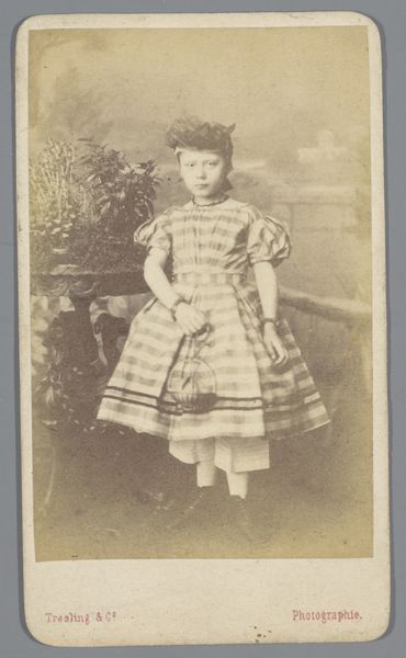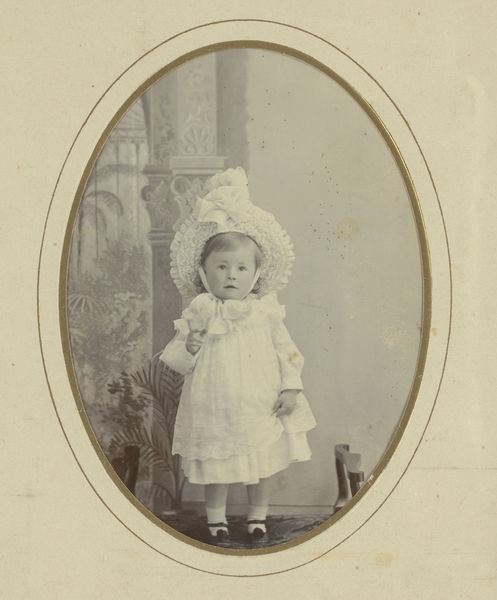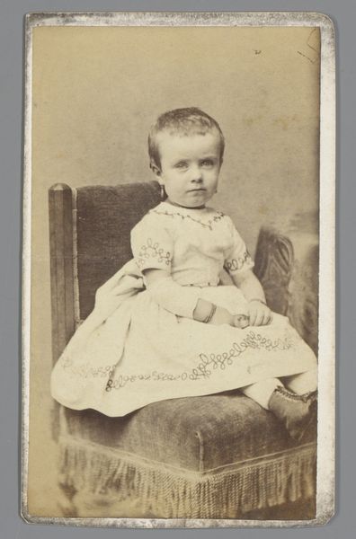 Editor: Here we have E. Vogelsang's "Portret van een zittend meisje in klederdracht met witte muts, met korenaren in de hand," from 1884. It’s a photo, possibly with pencil on paper. I’m struck by how staged it feels, yet also strangely intimate. What's your take? Curator: I see this image primarily as a record of labor and its representation. Look at the materials: a photographic print, perhaps lightly worked with pencil, attempting to capture and, in a way, freeze a specific cultural identity. The "klederdracht," the traditional clothing, speaks volumes about prescribed roles and community expectations. Editor: You're focusing on the clothing itself? Curator: Exactly. It’s a constructed image, not just a simple snapshot. The process involved selecting and arranging those clothes, likely manufactured or handmade through significant labor. The korenaren, the ears of grain, emphasize the rural, agrarian context and a potential idealized vision of peasant life. Do you think the photograph romanticizes the reality of labor at that time? Editor: I hadn’t considered that aspect so directly, but you’re right. The image definitely presents a clean, perhaps even glorified, vision of rural life. Curator: And consider the young girl herself. She becomes a vehicle for representing this constructed identity. Photography, as a relatively new medium at the time, plays a critical role in distributing and solidifying these images, impacting both local and broader understandings of culture and labor. The lace and finery cost money at that time, thus suggesting that she has at least partial distance from the work. Editor: It’s fascinating how the materials and the means of production become so central to understanding the image's cultural message. Curator: Precisely! It highlights how seemingly simple images can be deeply embedded in the social and economic fabric of their time. I learned today it makes you reconsider portraiture more as manufactured context and idealized symbol.