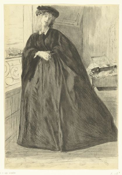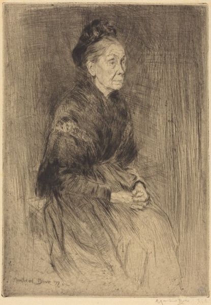 Curator: Before us is James Abbott McNeill Whistler's "Finette," a pencil drawing dating back to 1859. What's your initial take on this portrait? Editor: It feels melancholic, almost haunted. The starkness of the pencil against the paper and the woman's averted gaze contribute to this feeling of quiet resignation. The composition, too, is striking—the figure is dominant, almost looming. Curator: Dominant indeed, especially if we consider the availability and distribution of materials that contributed to its making. Paper became more industrialized in the mid-19th century, leading to increased availability for artists to experiment and produce such a portrait as a reflection of social issues. Editor: That industrial connection is fascinating, but it's hard to ignore Whistler's skill in rendering textures, and he must be acutely aware of formal arrangements. Look at the draping of her gown. See the balance he achieves between detail in the fabric and the relatively empty space. Semiotically, her costume also invites analysis. Her simple costume symbolizes that women belonged at home in this era. Curator: The costume may communicate submission, but I also read defiance in the way her dress overwhelms the smallness of her physical presence; maybe she resists this prescribed idea of women's placement in society, finding power through what she makes, wears, and how her likeness gets circulated as an image. Do you think of this aspect of the woman’s labor—performing femininity for portraits—at all in your own analysis? Editor: Well, such speculation falls outside the rigorous boundaries of formalism, which centers solely on tangible artwork attributes. While cultural background could matter, it's only secondary. And while there are those vague references of women not having many places in public spheres at that time, our discussion needs focus. To be precise, I value her subtle details achieved by pencil strokes! Curator: To bring together what we each focus on: her details achieved with these relatively accessible materials— pencil on paper—speak volumes on gender relations as social material! Editor: Quite an intersection, focusing both on the hand of the artist and its broader connections. A satisfying end to our examination!