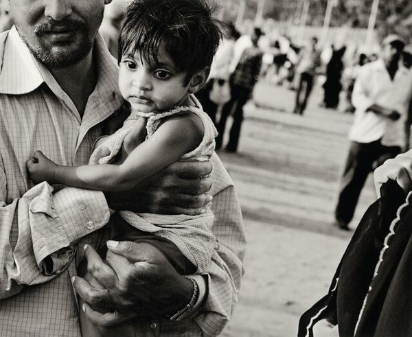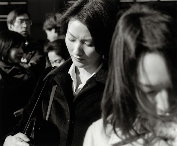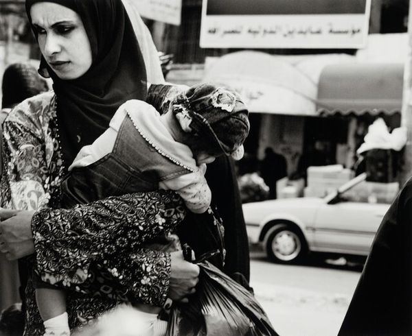 Editor: Let's discuss Leo Rubinfien’s “Hebron, 2008, at the Qurtuba School”, a black and white photograph. There's something so unsettling about the way the subjects seem to peer out at the viewer, their faces partially obscured. What do you make of it? Curator: That unsettling feeling, I think, is central to understanding the photograph's power. Consider the historical context: Hebron is a city marked by conflict. What do you think the framing, this sense of being watched, contributes to our understanding of that socio-political landscape? Editor: I guess it makes you feel like you're intruding on a private moment, or even witnessing something you shouldn't be seeing. Is that what the artist was trying to do, implicate the viewer? Curator: It's plausible. Photography has often been used as a tool of both documentation and political commentary. By presenting these figures, possibly students, in this fragmented way, Rubinfien avoids simplistic representation. Instead, the photograph raises questions about observation, about power, about the act of seeing itself. What choices does the photographer make to put you in this uncomfortable position as the viewer? Editor: The cropping is so tight, and the contrast in monochrome, with the eyes peering out like that. And, also, you are made aware of being excluded as much as included. It highlights this sense of separation and tension. It’s a bit of a relief to understand how context really transforms the viewing experience. Curator: Precisely! Understanding the historical and political context enriches our understanding. It challenges us to move beyond the aesthetic and consider the complex power dynamics at play. Editor: Thanks, that’s given me a lot to consider when viewing this piece. Curator: Absolutely. Keep questioning what you are seeing and place it in history, and it'll tell you more!