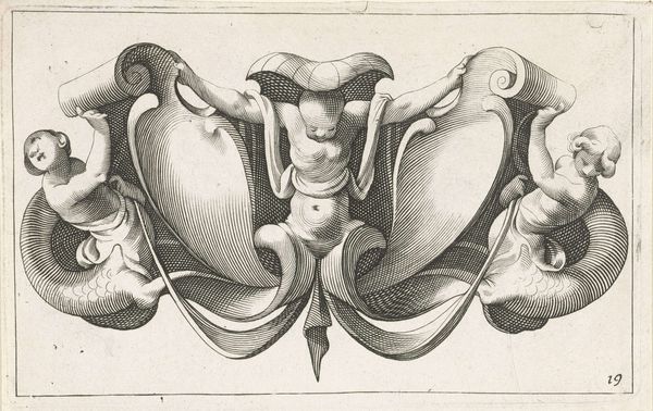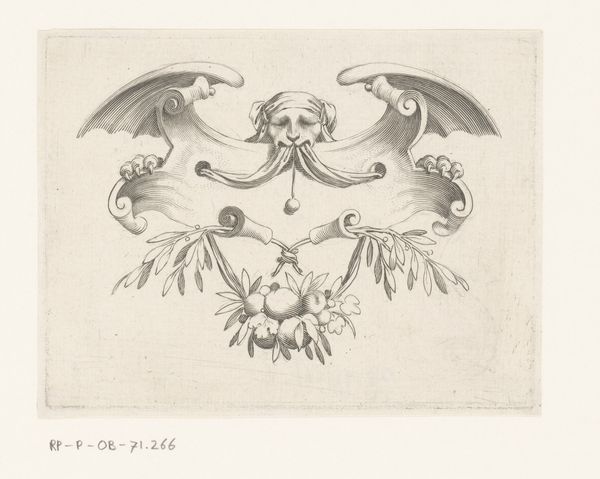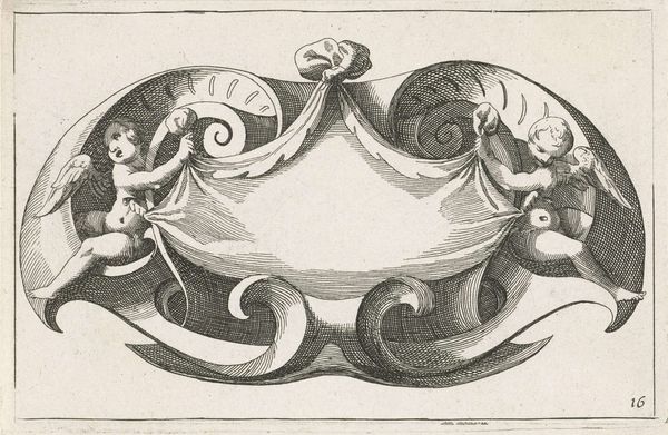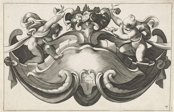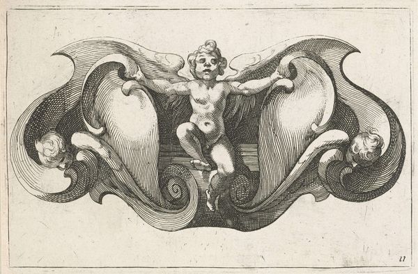 Curator: Here we have "Horizontale cartouche met twee vierkante compartimenten," a Baroque engraving created sometime between 1657 and 1685. It's currently housed here at the Rijksmuseum. Editor: My goodness, talk about a visual feast! My first impression is controlled chaos; those symmetrical swirls are almost hypnotic. It looks like a frame for a declaration, a stage for something… important. Curator: That's an astute observation. The piece presents a symmetrical cartouche intended for text or images. Consider the emotional language communicated through those swirling baroque flourishes and figures. At the center, we find a cherubic figure; grotesque masks adorn either side. The interplay suggests a delicate balance, or even a struggle between innocence and the profane. Editor: Ooh, a struggle. I love that! To me, the cherub seems almost trapped, clinging to this elaborate frame. It highlights something fascinating to me: the frame almost overpowers what should be central! The viewer's eye is drawn to all that line work; the cherub is almost an afterthought. Curator: Indeed. That deliberate visual hierarchy speaks volumes. The style itself carries so much cultural weight. Baroque designs are frequently found in aristocratic contexts. These prints allowed the widespread dissemination of such ornamental concepts; the motifs would become recognizable symbols of prestige and power. Editor: And even now, centuries later, it *feels* grand, like it wants to belong on something that *matters*. The line work too. It's amazing to consider that someone, ages ago, meticulously crafted those curves! Curator: Precisely. Consider, too, the material: a print. Accessible, reproducible. The artwork blurs the boundaries of the sacred and secular, high and low, offering a snapshot of its time. Editor: Well, now I see it as more than *just* fancy! This little engraving becomes this tiny, perfect echo from history. What a beautiful frame around the past. Curator: Agreed; It invites you to meditate on its function and what narratives it once served to elevate and frame.