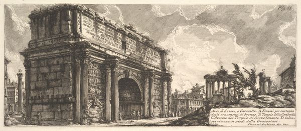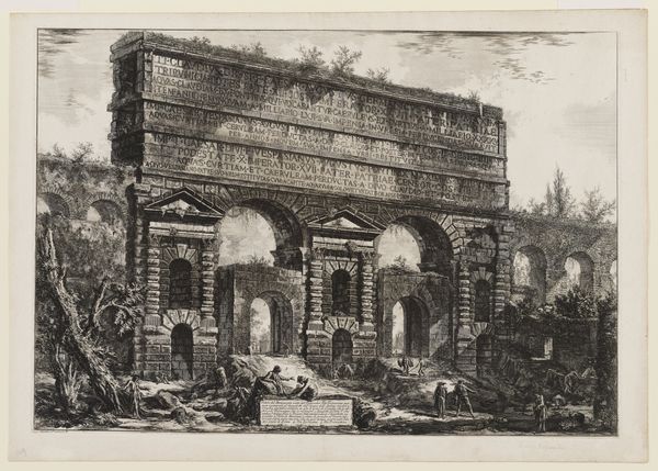 Giovanni Battista Piranesi created this etching of the View of the Porta Maggiore. Its stark contrasts and intricate detail evoke a sense of awe. Piranesi masterfully uses line and texture to depict the monumental scale and decaying grandeur of the ancient Roman gate. The composition, organized around the massive, inscription-laden structure, emphasizes the weight and permanence of Roman architecture. Piranesi's work engages with the sublime, where the experience of the grand and overwhelming evokes both admiration and a sense of human insignificance. His technique reflects an interest in classical forms but also shows a sensitivity to the effects of time and decay on these structures. Piranesi's focus on the material reality of the ruins—the rough textures, the broken edges, and the overgrowth—challenges idealized notions of classical perfection. He presents us with a complex interplay between past glory and present decay, inviting us to reflect on the nature of history and memory. Piranesi captures not just the physical form of the Porta Maggiore but also its symbolic weight.