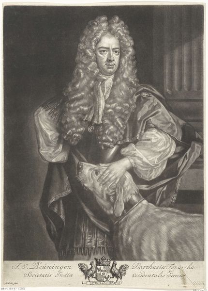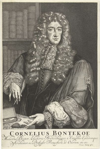 Curator: Here we have Pieter Schenk's "Portret van Johannes Dolaeus," an engraving made sometime between 1670 and 1713, now held in the Rijksmuseum collection. Editor: It strikes me immediately as a very performative image. The wig, the pose, the implied wealth--it's all about projecting status and knowledge. Curator: Absolutely. Let's consider the materiality: engraving. This is a reproducible image, a printed portrait, hinting at a market for these kinds of status symbols. Dolaeus was, as we see inscribed below the image, a medical doctor. Think about the networks required for Schenk to create and disseminate the portrait of Dolaeus in Amsterdam. Editor: The trappings of learning, literally at his back! The shelves overflowing with books suggests that Dolaeus wishes to project wisdom and scholarship. I can also see Vanitas symbols; everything here serves the purpose of immortalizing the subject. It says "remember me," through signifiers of worldly power. Curator: Note the technical skill; the labor put into recreating fabric texture, the sheer volume of that wig, must have required an extraordinary investment of time and skill by the engraver. I am fascinated by the means of image production. We can speculate about who the image served, whether Dolaeus commissioned this print or Schenk did. It’s intriguing to ponder who was selling and buying. Editor: Yes, I'm interested in the fashioning of a persona here, but let's look deeper at how persistent images, or pictorial formulas, come to convey deeper layers of meanings than pure marketing. The clothing signals social position, of course, but also an alignment with powerful archetypes of learning, piety, or governance. These don't just "mean," they allow Dolaeus to access historical notions of power and legacy. Curator: By considering the material, technique and conditions of artistic production, and modes of its distribution and consumption, we can understand not just how he appears, but how a particular construction of social relations solidified. Editor: I've been thinking about how symbols persist, but also subtly change their meanings across cultures and time, shaping how we interpret portraits. This has given me food for thought.