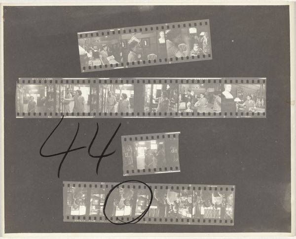Robert Frank’s "11th Street story 57" captures a sequence of moments, presented through the raw materiality of photographic film. The monochrome palette emphasizes stark contrasts between light and shadow, immediately creating a sense of urban grit and a somber mood. The composition is fragmented, with strips of film laid out to reveal multiple shots of a man. This serial arrangement challenges the singular, decisive moment typically associated with photography. Instead, Frank offers a layered narrative, dissecting time and movement into discrete units. We see the man eating, perhaps a worker on break, against an indistinct backdrop. Frank's use of the film strip itself, complete with sprocket holes and handwritten annotations, further disrupts traditional notions of photographic representation. The very structure of the medium becomes part of the artwork's content. The effect is to dismantle the image's fixity, offering it instead as a field of possibilities, of moments captured and then consciously arranged. Frank invites us to see photography not as a mirror, but as a language.