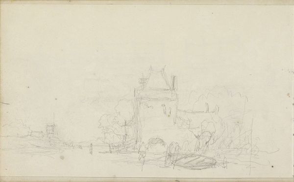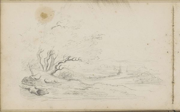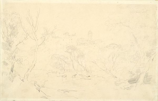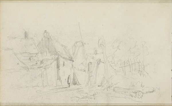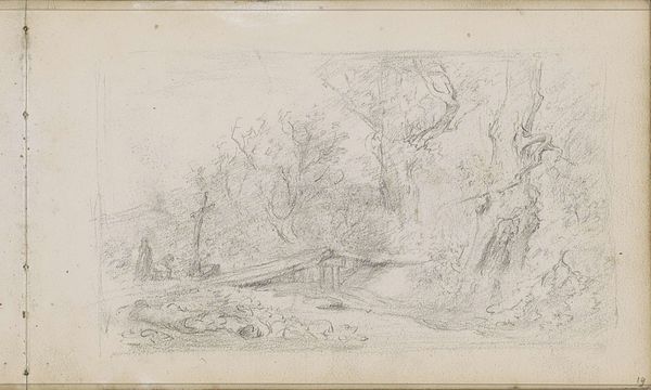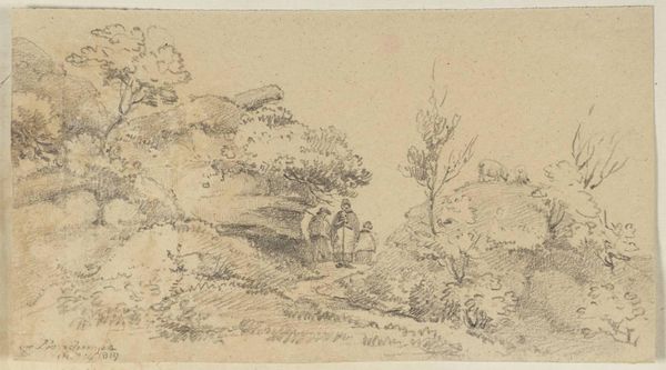 Editor: We are looking at "Landscape with Figures on a Path," a pencil drawing made in 1874 by Willem Cornelis Rip. I’m immediately struck by its subdued quality, this dreamlike, delicate atmosphere. What catches your eye, how would you interpret this work? Curator: Primarily, I note the strategic deployment of line and the tonal variations achieved with pencil. Observe how Rip creates depth not through dramatic shifts in perspective, but through subtle gradations of shade. The formal interplay between the barren trees on the left and the blurred, indeterminate forms to the right establishes a compelling visual rhythm. Editor: So, you're saying it's more about the 'how' than the 'what' in this piece? What about the group of people, are they significant at all, or is that part of the landscape like a tree? Curator: The figures function less as individuals and more as compositional elements, almost abstract shapes that further articulate the planar structure. Their placement is critical to the overall balance and distribution of visual weight within the pictorial space. Editor: I see, so it's like they're contributing to the form and rhythm, almost like notes in a visual melody? Curator: Precisely. The drawing's true subject lies not in mimetic representation, but in the artist's formal arrangement of lines, tones, and forms. Editor: It gives me a completely new understanding and way of looking at this drawing. Thanks! Curator: My pleasure. I was pleased to use the elements of the piece and discuss the formalism embedded within it.