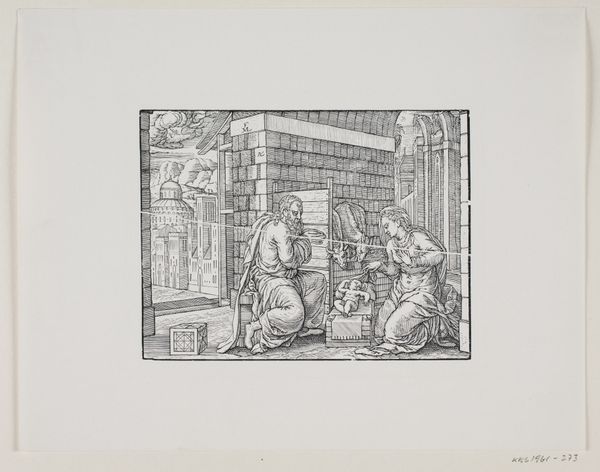 Curator: This intricate engraving, "The Visitation," was created by Melchior Lorck around 1574. Note how he renders this biblical encounter between Mary and Elizabeth with such detail. What’s your immediate response to this piece? Editor: It's like stepping into a dream, a meticulously rendered dream. The two figures meeting against that almost operatic backdrop. It's both intimate and epic, you know? Does the landscape distract you? It doesn't distract me. Curator: It's typical of Northern Renaissance art, I would suggest. These historical paintings integrated into a landscape reflect the Renaissance concern with representing the natural world and telling sacred stories for a new secular audience. These engravings democratized art and religious knowledge. Editor: I feel that tension between intimacy and something bigger, grander. You said ‘democratization of art,’ but for me this is, despite all of its social implications and background details, such an interpersonal thing. Like those mountains—they aren't really THERE there. Do you see? Curator: True. Although it adheres to a historical, religious narrative, the piece invites multiple readings. One could consider, perhaps, that Lorck isn't just portraying an event but using it to explore broader themes. For instance, notice how the formal, structured architecture contrasts sharply with the undulating landscape in the background. What do you suppose that suggests about the social order that influenced the artwork? Editor: You're right. That feels totally… intended. Look how sharp everything becomes as the artwork pulls us closer. In a similar way, the women hold each other. I love that gesture so much. Everything else in the work—every pillar and building in the background, it seems, would topple over without it. Curator: Exactly. It also underscores how an artist navigated expectations during the Renaissance and how artistic vision shaped—and was shaped by—socio-political considerations. Editor: You see everything as so plotted. The hand-to-hand for me here is much simpler: Lorck captured something truly holy. He did this, by the way, with ink and metal—a testament to how emotion and line can really blend to give a person goosebumps. Anyway, it's time for a beer. I'm heading out. Curator: A fitting end, then, wouldn't you say? Thanks for lending me your ideas and perspectives, and have a great evening!