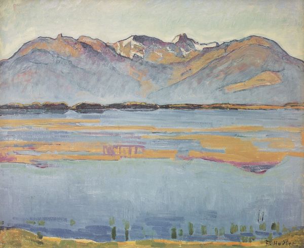 Curator: This is Ferdinand Hodler's "Thun, Stockhornkette," painted around 1910. Look closely at how the lake, landscape, and mountain range stack, creating a unique rhythm of shape. Editor: It has a sort of stillness. An uncanny calmness radiating from this composition despite its slightly crude use of, what seems to be, oil paints. The stark horizontal planes draw the eye across, yet hold you captive in their grasp. Curator: Yes, it’s interesting to consider the landscape tradition and Hodler's place within it. His landscapes often explored themes of national identity in Switzerland at the turn of the century. They engaged the social and political importance of landscape at a time when it played a crucial role in Swiss identity. Editor: This image gives me pause, what was the function of these muted colors at this time? Perhaps something to do with a feeling of economic tension and changing times? I think about the materials he used and what was at his disposal at the time: were these pigments cheap or hard to access? I ponder what the canvas was made from as I gaze upon the pale tones, what was the artist wanting the consumer to connect with when creating these images. Curator: That is indeed relevant, because Hodler’s methodical, repetitive brushstrokes evoke a deliberate process of working, calling attention to the labor of art making itself. Hodler uses a very restricted palette. This resonates, I think, with his socialist leanings. The simplification pushes the painting closer to abstraction, further questioning traditional notions of value and production. Editor: Absolutely. Thinking about the relationship of landscape to the economy helps explain it; to see landscape not as just something pretty but an idea which connects labor and resources. What does the landscape *do*? It’s fascinating to think about how material limitations could've actually fueled some truly radical aesthetic choices. Curator: Considering all the work we've looked at today, the intersection of visual art with its socio-political contexts feels especially urgent in Hodler's piece. We get an insight into Switzerland's positioning within Europe, from this perspective, but also the individual and the country as a wider framework of identity. Editor: Looking at the piece now and reflecting upon it; these new considerations open new pathways and ideas I wouldn't have normally thought of.