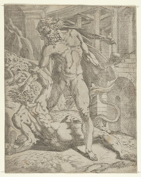 Curator: Ah, Hercules in the Underworld... I find this print, Hercules en Cerberus, from sometime between 1679 and 1728 and attributed to Jean-Baptiste de Poilly, rather compelling. Editor: My goodness, it has such an intensity! The drama practically leaps off the paper, doesn't it? Is this more than just a heroic figure? Curator: Well, look at Hercules. Poilly captures him from the back, so stoic, almost weary. He’s got his club over his shoulder, that heavy musculature rippling with fatigue. It's a study in strength, not just physical but also of will. And what is more Baroque than a strong muscular guy with his doggie... or dogs in this case! Editor: True, the Cerberus! Talk about your symbolic guard dogs. The artist gives Cerberus a wonderfully menacing personality here! Every head snapping, teeth bared... The tension between control and barely contained chaos... That dog personifies hell itself! I also find this landscape pretty depressing. Curator: You’ve hit upon something. Historically, three-headed dogs guarding the underworld is one hell of a metaphor, if you’ll pardon the pun. The psychological layers here are potent, speaking to primal fears but also, you know, how you can make something ferocious if it defends the way to your place... Editor: Defending the place of souls, if you take the Cerberus symbol literally. As an icon, Cerberus isn't just some wild beast but this embodiment of the point of no return. Looking at this baroque interpretation makes one wonder what's waiting in this afterlife. But what can we say about Hercules here? The guy in the artwork. I love this man's body but it would be good to learn something more about this strong guy! Curator: Ah, to see someone go beyond! Hercules, as captured in the image, faces the monster but not really, he goes on, seemingly undisturbed. I wonder how it feels for Hercules, on the other hand... perhaps he faces challenges within himself? You know that for some people that internal Cerberus may be stronger than that of the exterior. Editor: That's it, and a valuable closing thought. I'll look at Poilly's print differently, I can tell you that! Thanks! Curator: Thank you too for accompanying me in front of such an iconographic piece!