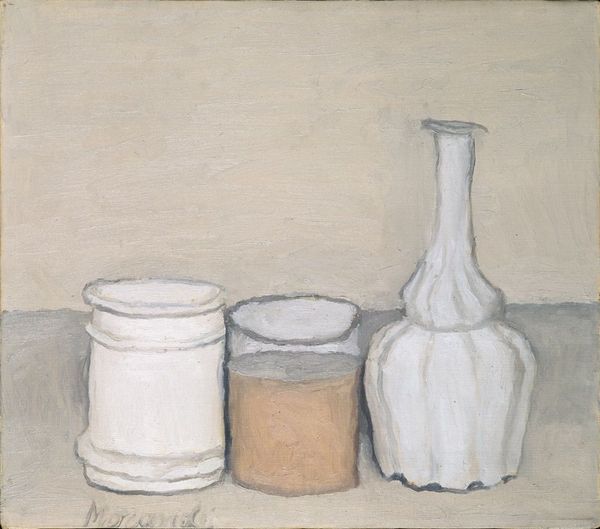 Editor: So, this is Vilhelm Lundstrom’s “Still Life with a Jar, a Sauceboat and a Bottle” from 1920, an oil painting on canvas. It feels surprisingly… weighty? What do you see in this piece beyond the obvious objects? Curator: I see a meditation on domesticity and its complicated role in a rapidly changing society. The weighty forms you noticed contrast starkly with the ephemerality often associated with still life. Think about what it meant to depict these common objects in the wake of the First World War. Were traditional notions of home and comfort still holding true? Editor: That's interesting. So you're saying Lundstrom isn't just painting objects, but is actually commenting on the state of society through them? Curator: Precisely. The simplification of forms hints at a broader move towards abstraction in art, reflecting the questioning of established norms that followed the war. The stark light and shadow could be interpreted as symbolic of the clear division that ran through Europe at that time, as well as ideas surrounding class and identity. What stories do you think these objects could tell, if they could speak? Editor: I hadn’t considered that these ordinary things could carry so much meaning, about loss and changes to the status quo. Now, I can see that there is a lot to unpack with those few kitchen objects! Curator: Exactly! We can view this painting through the lens of cultural disruption. By understanding this painting as more than decorative, we start to comprehend the true role art played. Editor: That makes so much sense. I’ll never look at a still life the same way again! Thanks for your time!