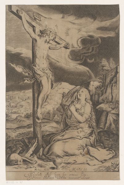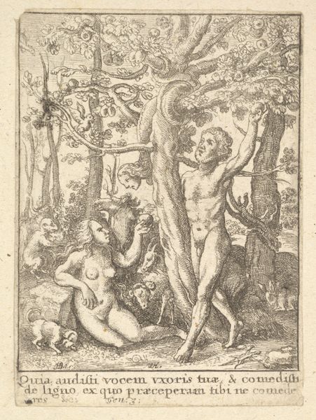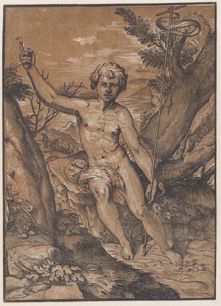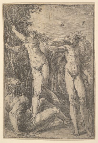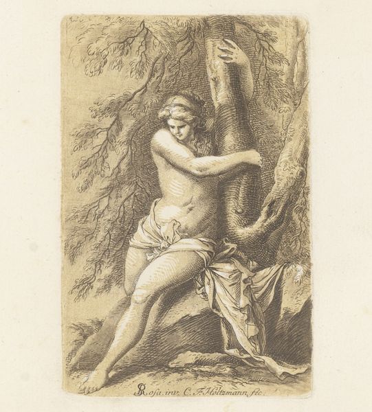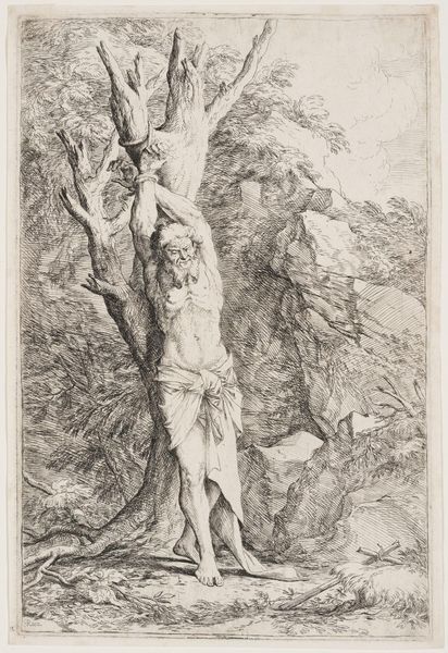 Curator: This engraving, “Half-Naked Man with His Hands Bound to a Tree,” was created in 1761 by Carl Friedrich Holtzmann. Editor: It’s… bleak. There’s an immediate sense of vulnerability. The lone figure tied to a bare tree evokes captivity, maybe even sacrifice. The raw exposure and the desolate background amplify that feeling. Curator: Precisely. Consider the visual language – the Baroque era, with its penchant for drama and intense emotion. The binding acts as a metaphor for restraint, powerlessness. Given the period’s complex power dynamics, it invites analysis through postcolonial and critical race theory. Editor: Absolutely. The figure is vulnerable but his gaze meets our own. There’s an assertion there too. I'm particularly struck by the rope binding his hands - a repeated visual motif throughout history. Chains of enslavement but also bonds of spiritual obligation or destiny. Does Holtzmann want us to consider which symbolic reading is appropriate? Curator: A key aspect often overlooked is the socio-economic framework that contextualizes art of this period, the art was primarily created by men for men, and what we may call today "male gaze" often portrayed the female figure nude as to be seen; in this case Holtzmann presents a male body to the male viewer, maybe intending for that feeling of compassion to be present or perhaps... envy? Editor: Interesting. It pulls you back to reflect on art history and it´s visual coding. Considering Holtzmann was working at a time marked by social transformation, how much does the depiction of the man in this scene as helpless become an implicit criticism of existing hierarchies? Curator: The piece begs a reflection on the role of historical trauma and art's role as an indictment of social wrongs. But that figure—bound, vulnerable—challenges normative representations and makes way for narratives that acknowledge complexity of the power dynamics. Editor: A somber but crucial depiction to grapple with even today, I think. The visual echoes resound with layered meanings for anyone open to seeing them.