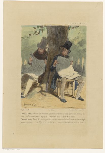 Curator: So, tell me what catches your eye about this drawing? Editor: We’re looking at a drawing called "Spotprent op de klerikale partijen en het onderwijs, 1885" or "Cartoon of the clerical parties and education, 1885" by Johan Michael Schmidt Crans. It seems to be made with pen and ink. There's this enormous tree labeled 'Onderwys' or 'Education' being attacked at the roots by these two characters... it definitely has a critical or maybe satirical mood to it. What's your take on this piece? Curator: Well, isn't it just ripe for interpretation? I’m immediately drawn to the way the artist uses symbolism. The tree, a common symbol of life and growth, represents "Education," and the branches are labeled with different levels of education. And then you’ve got these figures hacking away. To me, the humor’s pretty dark – there's something terribly knowing in their diligence to undermining a positive symbol such as education. Who do you think these 'clerical parties' are supposed to represent and what’s their goal here? Editor: Given that the drawing critiques clerical parties in 1885, I would guess that these figures embody the influence of religious institutions. Perhaps, the artist felt these parties were hindering progress by meddling with secular education. But, by “hacking” do you feel they mean to simply destroy it? Curator: Precisely. It makes me consider the historical context of church versus state at that time in Europe. A heavy question hidden behind what appears to be quite a funny little drawing. Editor: That’s an angle I hadn't considered. It highlights how cartoons can pack quite an intellectual punch. Curator: Indeed, revealing layer upon layer. Art is at its best, don't you agree, when you can keep on digging, finding something new each time?