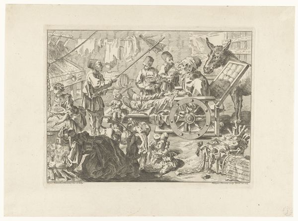 This illustration of a scene from Tasso’s ‘Gerusalemme Liberata’ was made by Antonio Tempesta sometime before 1630, using the printmaking technique of etching. In etching, a metal plate is coated with a waxy ground. The artist then scratches into this surface with a needle, exposing the metal. When the plate is bathed in acid, an image is bitten into the metal wherever these lines have been drawn. The plate is then inked and printed. Tempesta’s etching demonstrates the great precision possible with this technique. The fineness of the lines allows for complex shading and a high level of detail. The figures and landscape are rendered with a remarkable economy of means. This speaks to Tempesta’s skill as a draughtsman, but also to the increasing demand for prints in early modern Europe. Etching, like engraving, allowed for the relatively quick and inexpensive reproduction of images, which could then be circulated widely. Considering this print, it is useful to remember that even so-called ‘fine art’ objects owe their existence to industrial processes, and fit within a wider cycle of labor, politics, and consumption.