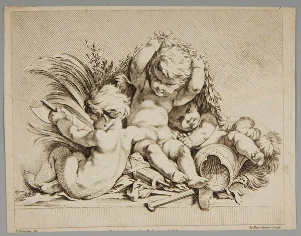 Editor: This drawing, "Wisdom Triumphing over Death, Evil, and Vice" by Bernart Prooijs, feels like a Renaissance morality play in miniature. The figure of Wisdom is so assertive! What do you see in this piece beyond the obvious symbolism? Curator: It's crucial to consider the socio-political context. This era was rife with anxieties about mortality and morality, particularly fueled by religious and social upheaval. Prooijs's work engages with the intersectional themes of power, knowledge, and the subjugation of marginalized identities, with the female allegorical figure representing Wisdom. How does this image reflect or subvert dominant power structures of its time? Editor: It's powerful to think of it as a commentary on power structures, rather than just a straightforward moral lesson. Thanks! Curator: Indeed, art provides complex visual arguments and a space to question the status quo.