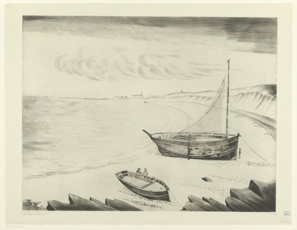 Editor: We are looking at Anne Kutka McCosh’s print, "The Rescue," created sometime between 1935 and 1939. It depicts a family in a small boat during a storm, rendered in pencil. There's a real sense of urgency and desperation. What do you see in this piece? Curator: I see a narrative steeped in resilience, survival, and possibly the socio-political anxieties of the late 1930s. Consider the context: the Great Depression, the looming threat of war. This family braving the storm could be a potent metaphor for the challenges faced by many. Notice the stark contrast between the figures huddled in the boat and the beckoning figure onshore; it invites questions of who is being rescued and from what? Editor: That's interesting. I hadn't considered the broader historical context. Do you think the artist is making a specific statement? Curator: Perhaps not a singular statement, but rather inviting us to contemplate the anxieties of a society on the brink. The precariousness of their situation, visualized through the storm and fragile boat, could reflect economic hardships, displacement, or even the growing threat of fascism. What is the gender dynamic that may reflect some form of inequality? Editor: That makes me see it differently. It's not just a dramatic scene, but a reflection of societal fears and struggles. Curator: Exactly! By viewing the artwork as more than just an image, we uncover rich narratives concerning socio-political conditions, resilience, and the complexities of human survival. It compels us to delve into history to really grasp it. Editor: Thank you. I see it's not enough to look only at what's in front of us; we also need to consider the context and deeper implications. Curator: Precisely, every element contributes to the meaning. Consider the medium: a print, implying mass production and dissemination—was this a message intended for a broad audience? Food for thought.