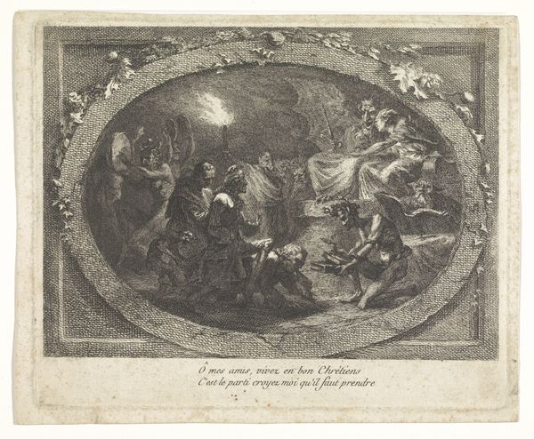 Curator: The piece before us is entitled "Mars en Venus met putti en Gratiën," translating to Mars and Venus with putti and Graces. Created between 1679 and 1728, this engraving is attributed to Jean-Baptiste de Poilly. Editor: My initial response? A sense of meticulously rendered frivolity. The stark contrast inherent in engraving lends a curious tension to the sensuous scene depicted. The interplay of light and shadow articulates musculature but simultaneously lends an almost ethereal quality to their bodies. Curator: Precisely. De Poilly’s skill is evident in his command of line. Consider how he uses hatching and cross-hatching to create depth and texture, from the soft drapery to the more solid forms of the figures. It adheres closely to Baroque conventions, with its elaborate composition and allegorical subject matter. Editor: It certainly screams of a specific socio-cultural moment. We see a display of opulent leisure, catering to a wealthy elite who found value in these classical allegories. What's also fascinating is how prints like these circulated – making grand mythological narratives accessible and shaping broader artistic tastes. The reproductive nature of engraving means its significance lies in cultural dissemination as well as artistry. Curator: I agree. It's a conduit for a specific artistic vision. If you observe, the formal structure reflects that, the careful arrangement guiding the eye around a circular dynamic; note how the ornamental arch reinforces this organization. The curves soften any harsher contrasts created by its medium while still working within it, presenting Baroque values elegantly and classically through form itself. Editor: Thinking about the social context further enriches our understanding. The artist serves as more than just a crafter, the engraver’s work becoming embedded into broader mechanisms and histories that exceed individual genius: institutions influencing them just like materials enabling works Curator: An important point to keep in mind when looking and analyzing, and that applies as much to the past and present day of production and observation! Editor: Indeed. I find myself appreciating the meticulous detail with a newly awakened eye for the historical forces that shape not just art but perception.