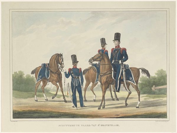 Curator: "Artillerie van de Linie," or Artillery of the Line, created around 1832-1833 by Victor Adam. What strikes you about this watercolor piece? Editor: Well, right away, I feel a curious detachment. The men and the landscape seem… isolated from one another. The detail in their uniforms contrasts so strongly with the almost bleached-out background. It feels less like a scene and more like a study in contrasts. Curator: Indeed. The Romantic style favored strong emotional content, yet the approach feels quite reserved, more about documentation. We're seeing the artillery regiment, likely depicted with considerable accuracy. It highlights a specific vision of military readiness in that era, where display and organization played crucial roles. Editor: So, almost like propaganda, carefully styled for public consumption? Were these types of paintings popular at the time? Curator: They certainly were part of shaping the image of the army. These detailed depictions helped reinforce national pride. Military scenes reminded viewers of their might but often at a careful distance from the real brutal experiences. It was important to present that image as sophisticated and highly structured. This watercolor format further lends itself to portability and reproducibility, thus enhancing its potential for wide circulation. Editor: And perhaps hiding the dirt and sweat with that lovely watercolor. It's interesting to see the visual presentation versus the reality of warfare. This piece shows a perfect, idealized regiment against an almost desert-like, barren landscape, ripe for conflict. A landscape of potential but also isolation. The Romantic touch adds a deceptive sheen. Curator: A subtle, artistic sanitization, perhaps? The clean lines and pale palette do suggest a romanticized, rather clinical order. Editor: Maybe art as nation-building, but also, art as escapism. This artwork lets us step back in time and ponder our perspectives about wars. Curator: It's a reminder that art, even seemingly straightforward depictions, is steeped in purpose and intention, subtly influencing the viewer. Editor: So true. Every line, every wash of color speaks volumes about the choices made in presenting a carefully sculpted reality. Thanks for guiding my perception today.