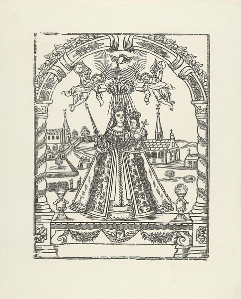 Editor: Here we have "S. Anna tot Botelaer," a print dating from somewhere between 1700 and 1865. It's an engraving, an intaglio piece showcasing figures in the baroque style. It looks so intricate. What jumps out at you? Curator: Immediately, I see the materiality of its production: the metal plate, the pressure of the press, and the labor involved in creating these lines. Considering it was made somewhere around 1700-1865, what social structures facilitated its creation and distribution? Was this mass-produced for popular consumption, or a luxury item for the elite? Editor: I didn't even consider the socioeconomic implications, focusing more on the religious imagery. So, are you saying the value lies not in the art, but what it tells us about labor, and materials? Curator: Precisely. The contrast between the fineness of the engraving and the potential exploitation of the craftspeople who produced it raises interesting questions. How does the depiction of Saint Anna reinforce certain power structures, perhaps even obscuring the labor behind the artwork? Notice the crown: how did the means to get that crown exist? Editor: It makes you rethink the beauty when you think about it like that. Perhaps looking beyond the art itself really expands what we take away from each piece. Curator: Exactly! Thinking critically about materials, means of production and how it shapes our consumption changes everything. Editor: I'll never look at prints the same way again! Thanks for the perspective.