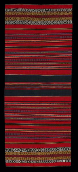 Editor: This vibrant textile, titled "Woman's Tzute," was created sometime between 1950 and 1960. It's made of woven cotton and held in the collection of the Minneapolis Institute of Art. The bold stripes and geometric patterns really jump out at you! What visual language do you see at play in this work? Curator: Well, the "Tzute" itself acts as a powerful symbol. More than just a simple head covering, in many Mayan communities, a Tzute functions as a vessel of identity. Can you see how the geometric abstractions, repeated across the textile, almost become a codified language? Editor: I can! Like, each stripe and diamond could represent something specific about the wearer or her community? Curator: Precisely! The weaver is embedding meaning through color and pattern. That central division reinforces a kind of duality, wouldn’t you say? Perhaps reflecting social roles or even spiritual beliefs held by this Maya community. Consider also how the repetition speaks to a collective memory. Does the color palette resonate with other visual elements from that culture? Editor: The vivid red certainly evokes warmth and energy and I suppose connects to many Indigenous cultures across the Americas... while the violet suggests a degree of nobility. Curator: Exactly, and notice the lower border's contrasting pattern. It almost anchors the vibrant field above, suggesting a link to ancestral heritage. I wonder, if you were to trace these designs across time, could you find echoes of older, shared traditions in the Maya people's identity? Editor: So much to consider about one seemingly simple woven cloth! Now I see this object less as decoration, and more as a layered narrative about Maya cultural memory and individual identity. Curator: Indeed. The “Tzute” whispers secrets to those willing to listen.