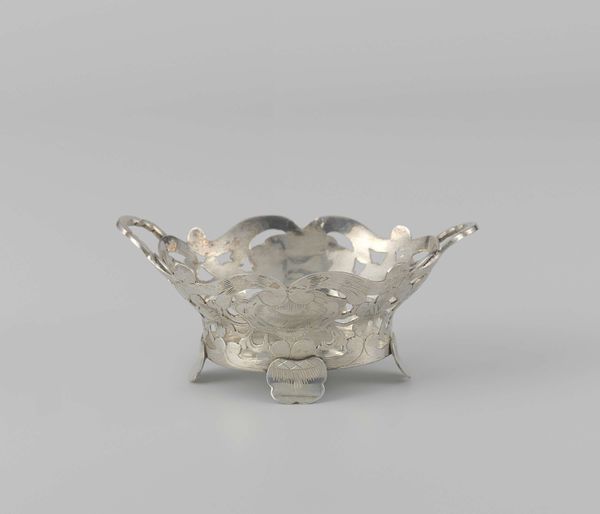 Curator: Here we have "Two-handled bowl," crafted between 1675 and 1700 by Jacob Boelen. You’ll find it on display here at The Metropolitan Museum of Art. Editor: The metallic sheen! It feels opulent, but also strangely restrained in its form. Curator: Indeed. Its silver surface presents a fascinating study in reflectivity, while the bowl’s contours, subtly Baroque, are echoed in its minimalist decorative carving. The two handles offer compelling lines, wouldn’t you agree? Editor: The bowl-shape panels bring the stylized tulip mania that obsessed much of Dutch art from the early seventeenth century through a significant portion of the Dutch Golden Age to mind. It projects an air of luxury tinged with transience. Curator: Very perceptive. Silverware like this often signified social standing during the late 17th century. Consider the precise repetition of forms here, these scallops repeating with machine-like precision. And it presents that kind of order to suggest stability and control. Editor: But doesn't it also underscore vulnerability? Such fragile luxury, constantly polished to maintain its glint against encroaching tarnish! The delicate handle shapes make one think of carefully protected family legacies, handed down with strict stipulations. Curator: An intriguing idea. I see that you read an element of mortality in what I regard to be controlled Baroque idealism. Note how the curved surface amplifies any imperfections, while the chasing emphasizes form and surface. The medium—metal itself— speaks volumes. Editor: Yes, the metallic body certainly underscores its weightiness, the societal role of status made palpable. Considering its Baroque influences, it is still quite measured for the period! Curator: Well said. It showcases a keen sense of form and purpose from the artist. Thank you. Editor: An absolute pleasure, as always. Thank you.