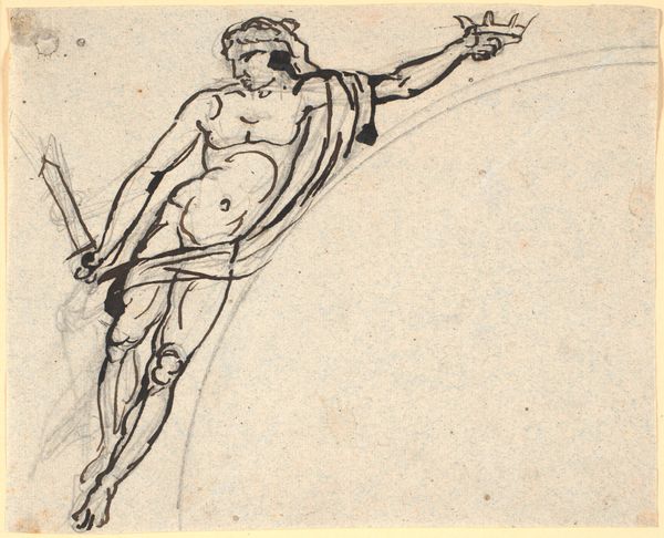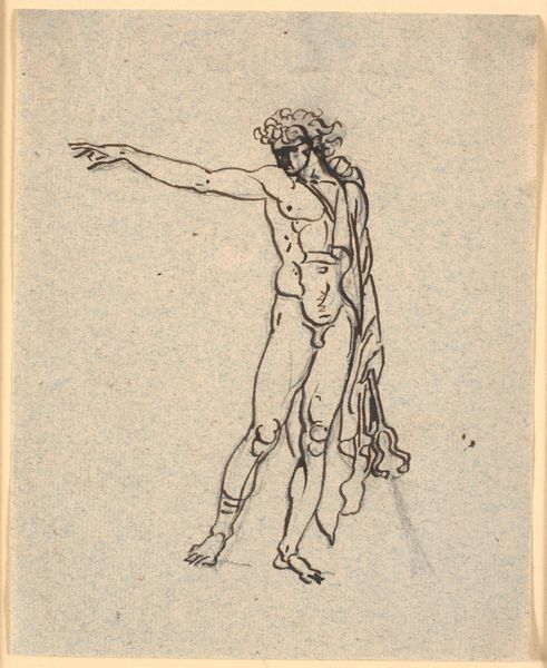 Curator: The artwork before us is "Siddende mandlig model" by Nicolai Abildgaard, estimated to have been created between 1743 and 1809. The piece is an ink drawing. Editor: My first impression is the tension created by the sharp, angular lines against the subject’s relaxed pose—almost languid, yet deliberately observed. Curator: Yes, look at the use of ink wash to describe the musculature and the light, indicative of Abildgaard’s classical realism style and academic training. The choice of ink suggests a study, a practice in rendering the human form. Editor: I’m immediately thinking about the male gaze embedded within academic art traditions and the social contexts that shape our perception of the nude body. How were images like this used to reinforce power dynamics within artistic institutions and beyond? Curator: Absolutely. One could further scrutinize the kind of paper employed. The material aspect reminds us this was not meant as high art, per se, but functions rather as a pedagogical exercise or a preliminary work—valuable both for its functionality and craftsmanship. Editor: And thinking about pedagogical exercises—what kind of body is being legitimized here? Who gets to represent, who is represented, and how did that representation shape constructions of masculinity, for instance, both then and now? The water jug to the right gives me pause. Curator: Well, we can consider its scale; it is secondary in compositional importance to the main subject. One can infer function, given proximity to the figure and the folded towel or drapery, all pointing to cleanliness, which indicates access to means that not everyone in Abildgaard’s contemporary society had access to. Editor: Yes, there's a whole system of valuation implied through that tiny jug. So much loaded information about social stratification. It pushes me to think of how our relationship to images such as these today invites and requires critique from all viewers. Curator: I think that’s key. A piece like this speaks to how labor, the means of artistic production, intersects with these broader themes of identity and politics you’ve highlighted. Editor: Right, considering the model and the presumed owner, the access points reflect so many societal power structures worth interrogating further. It gives me pause to consider. Curator: Definitely something to keep thinking about. Thanks for the stimulating conversation! Editor: My pleasure!