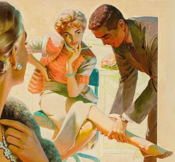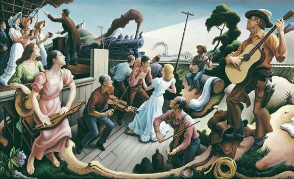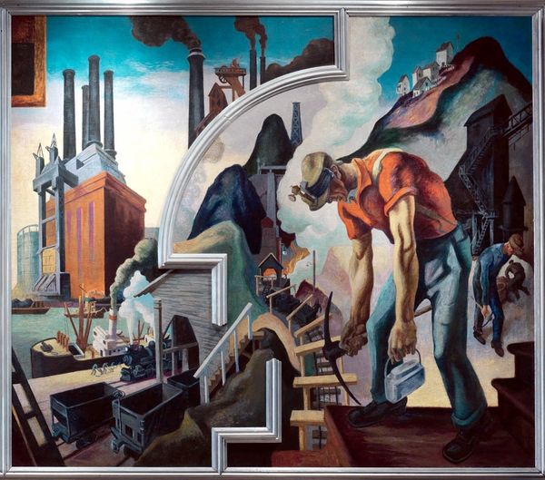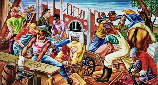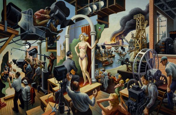Curator: It feels like stepping into a hazy dream, almost a rowdy tavern scene sprung to life from some old folk tale. Editor: You’re right, it certainly has that fantastical element. What we are looking at is actually a detail from Thomas Hart Benton's "A Social History of the State of Missouri," painted in 1936. It’s an oil-on-canvas mural, and this specific section focuses on beer making. Curator: Beer making, huh? I'm getting definite 'yeasty' vibes. You know, the light and shadow almost create a stage, don't they? Each figure posed like they are ready to raise their mugs at a performance, to celebrate the brewery production itself. Editor: Precisely! Benton was quite invested in showcasing the everyday labor that shaped Missouri's identity. Think of it in the broader context of Regionalism, an artistic movement that deliberately moved away from European abstraction. He shows industry: raw materials transformed through the combined effort and toil of working class folk, each element contributing to the creation and distribution of alcoholic beverages, not without hints of their eventual enjoyment and imbibing by the workers themselves. Curator: There’s almost something unsettling about it, though. Everyone looks so intensely involved, their faces… lined. Even the drinking worker with his huge tankard can only half smile. All this focus on work, production. Where’s the simple joy? Is Benton showing us how work overtakes us? Editor: Well, Benton never shied away from showing the gritty realities of life, labor was rarely romantic back then. Perhaps it's less a question of lost joy, and more a nod to the dignity found in the tangible result of their efforts. But his visual language certainly presents that effort with palpable muscular tension. Look at how he paints the machinery and buildings in the background, monolithic and geometric, so they reflect not just labor, but American social complexity. Curator: Hmmm...complexity brewed to perfection? I'll drink to that. There is also just so much going on – workers laboring, drinking… It’s so…dense, somehow, full of narrative layers, really. Editor: I find that idea apt, given how this mural compresses time and space within one pictorial field, interweaving history, labor, and perhaps a healthy dose of social commentary. I come away reminded of how much intention is infused even in art depicting labor and commodity production. Curator: And how little it sometimes betrays. Let’s just say I won’t be looking at my next pint of beer in the same way again.