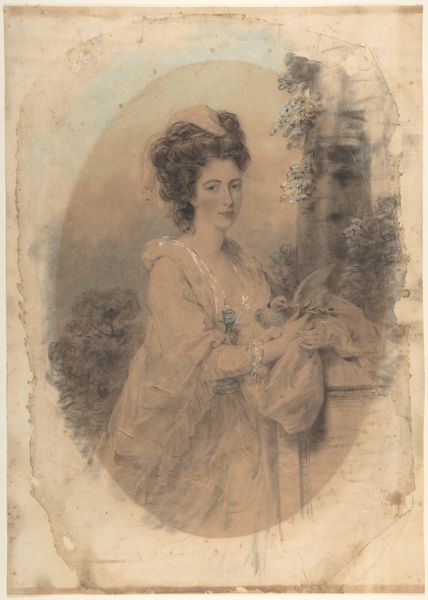 Editor: This is John Downman's "Portrait of a Woman," date unknown, housed here at the Art Institute of Chicago. It seems to be made with colored pencil and pastel on paper. There’s a fragility to the portrait that’s quite captivating. What strikes you most about this piece? Curator: Immediately, I’m drawn to consider this work within the context of portraiture's function in society. Oval portraits, especially in pastel, gained popularity as affordable alternatives to oil paintings for the burgeoning middle class in the late 18th century. How might this portrait, displayed in a public museum, shift its original intended purpose of intimate, private display to a broader audience and discourse? Editor: That’s interesting! So its accessibility was part of its original appeal? It being here, does that almost “elevate” its status? Curator: Exactly. The placement of this pastel drawing in a museum inherently transforms its cultural value. It invites questions about the artist's intended audience and whether its aesthetic qualities were meant for a discerning eye or for a wider appreciation of the sitter’s social standing and grace. We must think about whose stories museums choose to tell, and how they tell them. The choice to display "Portrait of a Woman," who remains anonymous to us, inevitably speaks volumes about shifting social values. Does it perhaps signal the desire to recover lesser known narratives and personalities? Editor: I see your point. I hadn't considered the museum's role in shaping the narrative around the piece. It also makes you think about the sitter too, and what that representation meant for her and her family. Curator: Absolutely, and how that representation might shift with each subsequent viewing by different audiences across generations. The pastel drawing offers insight into social history. These delicate images provide much deeper conversations about power, access, and enduring cultural meanings, even today. Editor: I never would have thought a small drawing could reveal such large, shifting roles of meaning, like social status! Thank you for sharing that insight. Curator: It's been a pleasure to delve into these ideas with you! It is rewarding to understand an artwork as part of greater structural elements that inform its very essence.