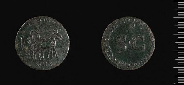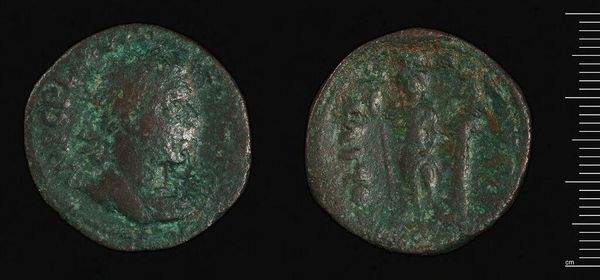 Curator: Here we have a Follis of Galerius, found in Trier. It's a copper coin, currently held in the Harvard Art Museums collection. Editor: The patina! That aged green is just so evocative. It speaks of centuries buried, empires risen and fallen. Curator: Indeed. Note the strong profile, the sharp, almost brutal lines of Galerius's face. It's a study in Roman portraiture. The balance between the inscription and the image provides a clear hierarchy. Editor: And on the reverse, the standing figure – likely a deity representing victory or prosperity – offering a sense of hope and imperial power through symbolic representation. It is a message crafted for its audience. Curator: Precisely. The incuse details, achieved through careful die striking, create both texture and meaning. Editor: A tiny object, yet it echoes with a history of human hopes, fears, and ambitions. Curator: Yes, its scale only magnifies its impact as a carefully designed piece of propaganda.