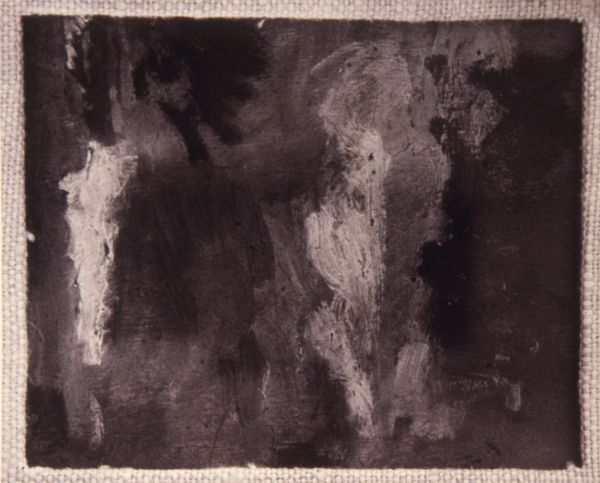 Curator: Edvard Munch's "Two Human Beings," presents us with a stark vision of isolation. Editor: The figures emerge from the darkness, almost spectral. The scraped textures contribute to an overall feeling of unease. Curator: Munch was deeply interested in exploring the human condition, often through a lens of anxiety and alienation prevalent in the late 19th and early 20th centuries. The figures seem unable to connect, trapped by their own internal experiences. Editor: The composition emphasizes their separation, doesn't it? They are parallel but not touching, their forms dissolved and indefinite. Curator: This speaks volumes about the societal alienation prevalent at the time, particularly concerning gender roles. Perhaps it is a depiction of the impossibility of genuine connection between the sexes. Editor: Possibly, but the visual language also implies that separation—it's not just the space between the figures, but the very disintegration of their forms. Curator: It truly captures a sense of profound existential loneliness. Editor: A loneliness made all the more poignant by the work's very structure.