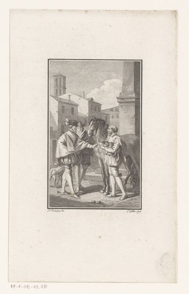 Curator: This is Daniel Nikolaus Chodowiecki's 1783 engraving, "Yoricks wagen wordt omringd door bedelaars," currently held in the Rijksmuseum. Editor: My initial impression? Claustrophobia. A tight knot of figures vying for space. It's intensely… busy, a visual scramble. Curator: Precisely. Consider Chodowiecki’s choice of the engraving medium. The etched lines, the contrast... it’s reproducible. This image wasn't destined for a palace wall. It was made to circulate, a commentary available to a broader public. Editor: Which speaks volumes, doesn’t it? Not just some decorative scene but a conversation starter for, presumably, uncomfortable truths about wealth and poverty right there in the streets of 18th-century Europe. The beggar’s expressions seem almost… accusatory. Curator: Note the specific detailing in clothing. Yorick, ostensibly a figure of some status, contrasts starkly with the ragged attire of those surrounding him. What raw materials make their clothes? How does their condition represent access—or lack thereof—to textiles and their production? These choices reflect societal structures. Editor: Material concerns laid bare! And the artist isn't hiding the socio-economic discomfort. What do you think, metaphorically, of his rendering the "Wagen", this wheeled mode of transport for someone clearly able to move without impediment surrounded by those in rags and on crutches... Curator: This is a city scene full of stark class divides. What would have it taken, in terms of human energy and capital, to maintain these carriages in comparison with sustaining the population, many of whom struggle for basic means. Editor: It's less about individual portraiture and more about systems and how individuals navigate them? No escaping that social matrix! I am left ruminating on the legacy of class in art and whether true, honest artistic depictions will endure for our contemporary society... Curator: A useful perspective. Analyzing an image like this pushes us beyond aesthetics into considerations of labour, resources, and social narratives embedded within everyday scenes. It becomes less about artistic mastery alone and more about revealing systems of power and their material impact.