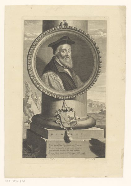 Editor: Here we have Antoine de Marcenay de Ghuy’s "Portret van een onbekende man en een rivierlandschap met twee figuren," from 1771, an etching that brings to mind the stark beauty of Baroque landscapes. The somber tones create such a weighty, almost melancholy mood. What strikes you most about it? Curator: You know, that pairing of a portrait and a landscape vignette always gets me. It's like two thoughts, not quite rhyming, placed together. The old man's face—so detailed, every line etched with a story—contrasts sharply with the idealized, almost ethereal landscape below. The engraving almost feels like a dream, a half-remembered story. I wonder if the juxtaposition means to highlight the transient nature of human existence against the eternal backdrop of nature. Editor: So, you see a connection between mortality and nature represented? Curator: Precisely! Look at the delicate lines, the way light seems to dance across the river, and the stillness of the man's gaze. Maybe de Ghuy is showing us that while individual lives are fleeting, the natural world endures, a constant witness. Tell me, does that stillness give you a sense of peace or unease? Editor: I think a little bit of both, actually. The portrait part is really captivating with all its textures and lines, and, the landscape gives this sense of timelessness. I'll definitely be looking at engravings differently now, thinking about their deeper symbolism. Curator: Excellent! Art isn't just about seeing; it's about feeling, interpreting, and weaving our own stories into the masterpiece. The magic, perhaps, is always the sum of those stories—both told, and untold.