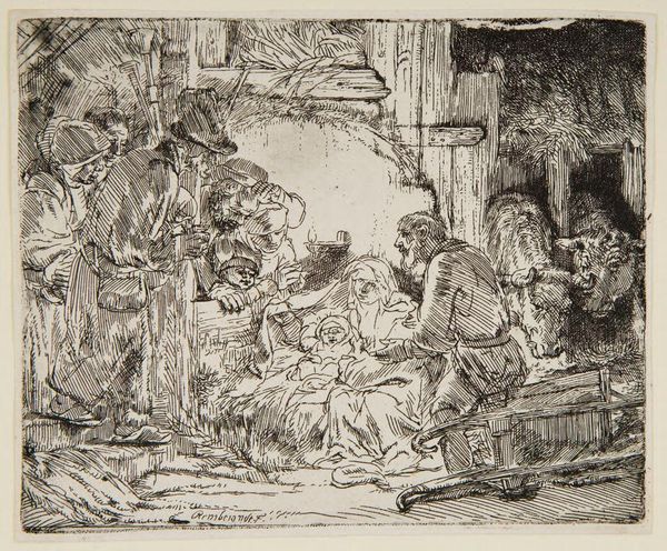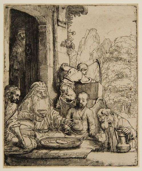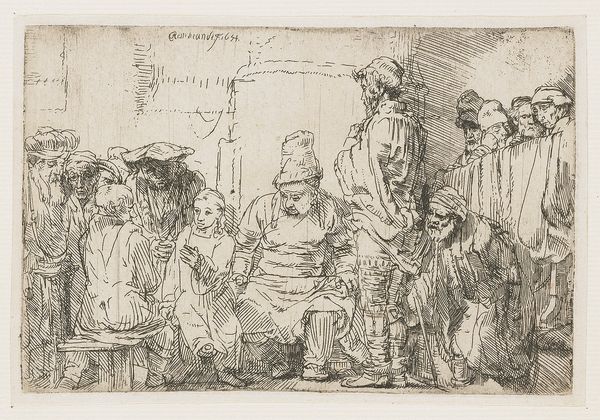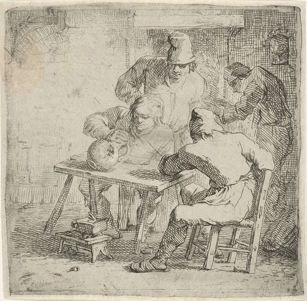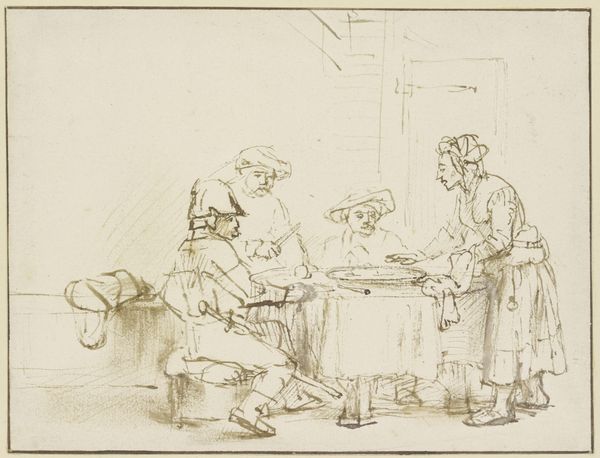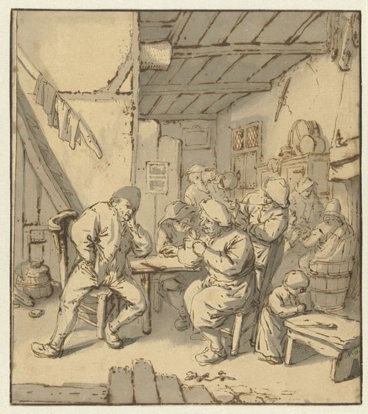 Editor: Here we have "Soldiers Enjoying Themselves in a Farmhouse," possibly from 1887, created by Hendrik Jacobus Scholten. It's an ink and pencil drawing. The composition strikes me; it’s so dynamic, all these figures packed into the scene with a real sense of chaos. How would you interpret this piece? Curator: The density of figures certainly dominates, doesn't it? Let us consider the spatial arrangement first. The artist establishes a clear foreground, populated by figures who serve to pull the viewer into the bustling scene, and we see the suggestion of recession through diminished scale and detail toward the back. Notice, too, the structural use of light and shadow to delineate form and create contrast, directing our eyes to various focal points within the composition. What does the artist achieve by using only tonal variation here, rather than, say, colour? Editor: It feels almost claustrophobic because of the limited colour palette. It heightens the mood somehow. You're talking about light – how would you say it shapes the composition, further? Curator: The interplay of light and shadow certainly reinforces the impression of a lively, perhaps even rowdy gathering. Notice how the darker tones serve to frame and emphasize the more illuminated areas, especially the faces around the table, which are alive with expression. Now consider the artist's technical skill in achieving such a wealth of detail and dynamism using relatively simple media like ink and pencil on toned paper. Doesn't it draw our attention to the fundamental elements of form and texture? Editor: Definitely, I see that now! So, the success is mostly because of its visual components. I really enjoyed delving into the compositional strategies used here to create such an energetic scene. Curator: Precisely. It underlines the way formal structures can inform the work and give it lasting presence.