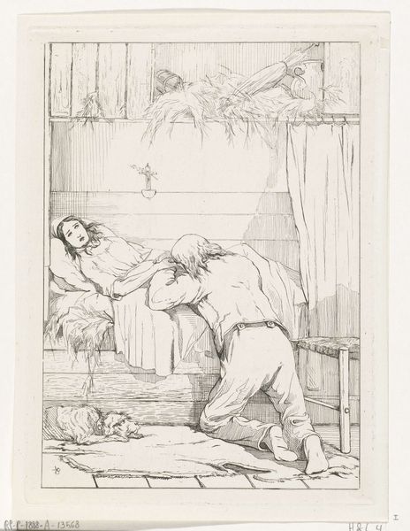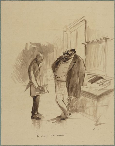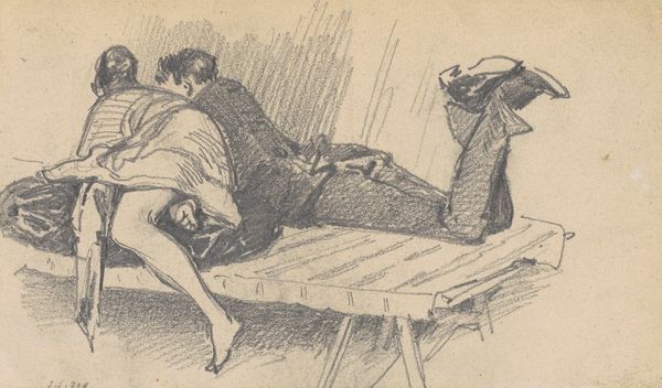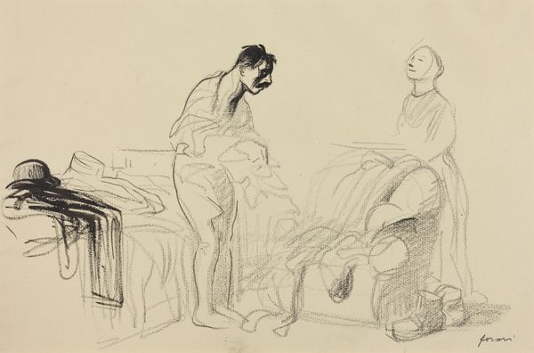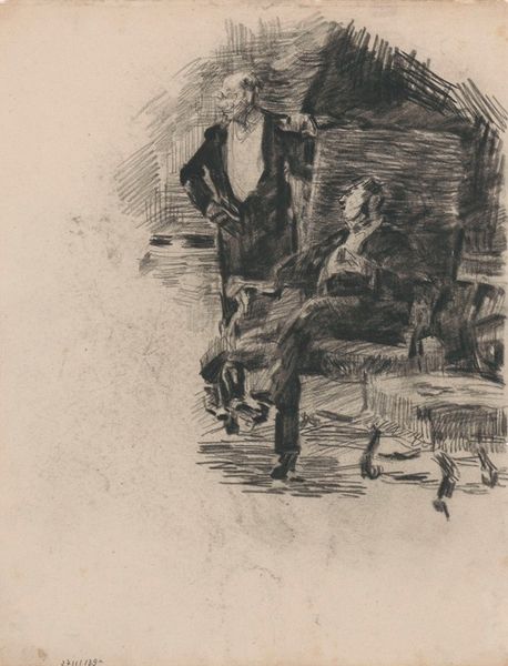 Editor: This drawing by Jean-Louis Forain, titled "Two Men in an Attic", depicts two figures in a sparsely furnished room. There's a distinct sense of melancholy and destitution in their postures and the overall sketchiness of the scene. What's your interpretation of this work? Curator: It's interesting how Forain, known for his Impressionistic style, here captures not just the visual scene but also the socio-economic realities of his time. The attic setting immediately evokes a sense of marginalization, doesn't it? Who occupies attics? Editor: Those on the margins, perhaps. Curator: Exactly. And the men’s posture, their downcast expressions… Consider this through the lens of late 19th-century Paris, a period marked by vast disparities between the wealthy elite and the working class. What could the hammer represent, in your opinion? Is it simply a tool, or something more? Editor: A tool, of course. But the man's tense grip and the overall atmosphere make me think it could also represent labour exploitation, maybe even a latent frustration on the verge of eruption? Curator: Precisely! Forain’s work often hints at the tensions bubbling beneath the surface of Parisian society. He uses impressionistic techniques to draw us into the psychological landscape of these figures, forcing us to confront the lived experiences of those often ignored or misrepresented in more traditional artistic depictions. The incompleteness is significant. Editor: So it is the open-endedness and suggestion that implicates us as viewers? Curator: Absolutely. By not offering a clear narrative, Forain challenges us to question our own roles and responsibilities in addressing these systemic inequalities. Editor: I never would have considered the political implications within this genre scene. It really brings the drawing to life in a completely new way. Curator: It reminds us that art, even in its subtlest forms, can serve as a potent catalyst for social awareness and change.