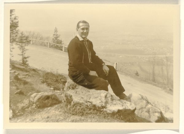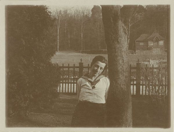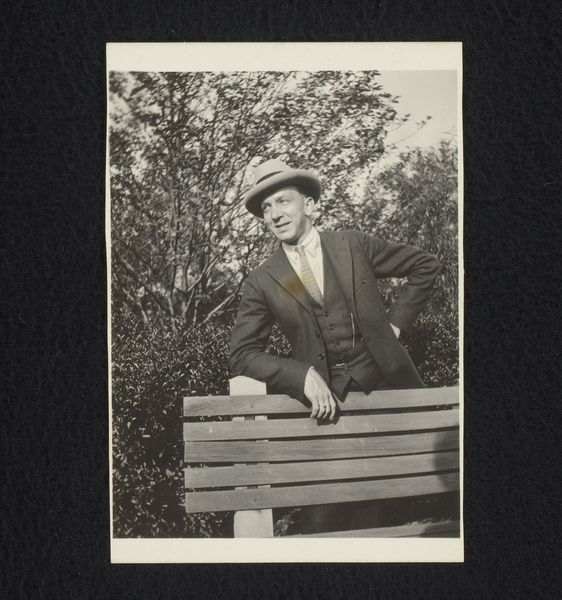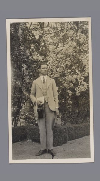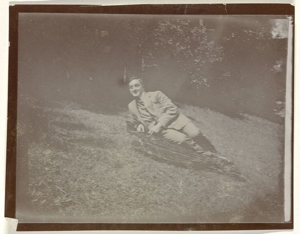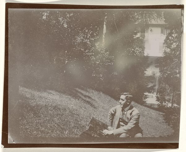 Editor: Here we have a photograph from 1913 titled "Eugen Wachenheimer, liggend in een tuin in Baden-Baden." It's quite a striking image; the subject looks almost melancholic amidst such a tranquil scene. It really pulls me in. What do you see in this piece? Curator: It whispers a quiet story, doesn't it? To me, this photograph embodies a kind of pensive stillness, something caught between formal portraiture and candid moment. The tilt of the landscape, the way the light dapples the grass – it all speaks of a world on the cusp of immense change. Perhaps Wachenheimer is contemplating the uncertainties of his time. He seems oddly removed. Don’t you think there’s a tension there? Editor: Definitely, a disconnect almost. Like he's observing, but not truly part of the landscape. Curator: Exactly. And consider the context: 1913, just before the world plunged into chaos. Is that reflected here, subtly? Or is it simply a fashionable man enjoying a nice day in Baden-Baden? Editor: The backdrop feels intentional somehow, not just happenstance. Like it’s carefully constructed. Curator: I agree! There's something performative about his pose. Photography back then was so new, still finding its feet between mimicking painting and capturing something entirely unique. Does this influence how we read the subject's mood, or even how he sees himself? These glimpses into the past always make you consider what we take for granted in art today. Editor: I hadn’t thought about that aspect of early photography so much before! Thanks, it’s given me a lot to think about. Curator: Absolutely! Art invites such questions and personal reactions, so dig deep when things connect, like this image.