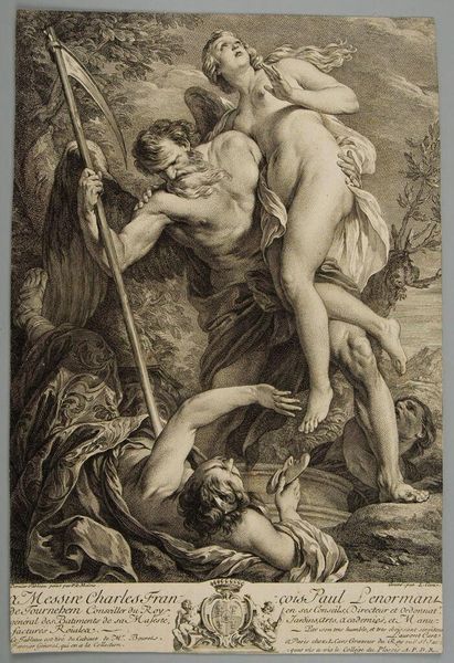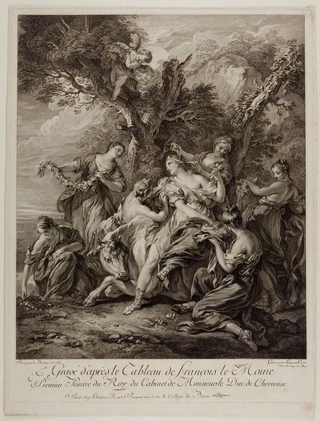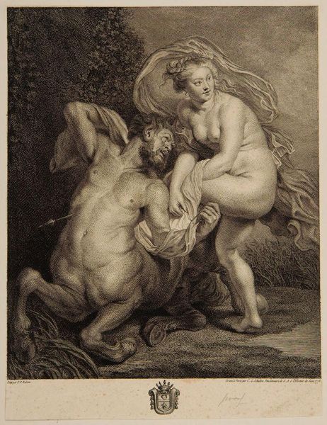 Curator: This engraving, "Hercules and Omphale," by Laurent Cars, is a fascinating take on the mythological power dynamic. Something about the tender moment is really pulling at me. Editor: Absolutely. It’s difficult to ignore how this image reverses traditional gender roles; it invites us to examine the socio-political narratives embedded within seemingly timeless stories. Hercules, the epitome of masculine strength, is feminized by Omphale, who has stripped him of his heroic symbols. Curator: There's a vulnerability here, a kind of gentle surrender. I love the way Omphale's gaze rests on him. It's…almost nurturing? Editor: Perhaps it speaks to how power can be wielded in ways that are both coercive and tender. The image challenges us to consider the implications of domination, seduction, and resistance in various forms. Curator: It does make you wonder, doesn't it? Is this a moment of genuine connection, or a performance of power? Editor: It's a potent reminder that even the strongest among us are susceptible to being disarmed. Curator: Well, whatever it is, this print's got my attention!