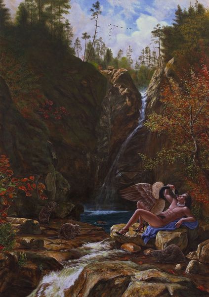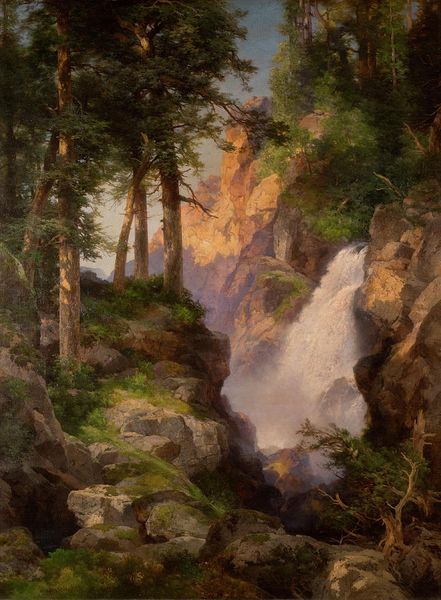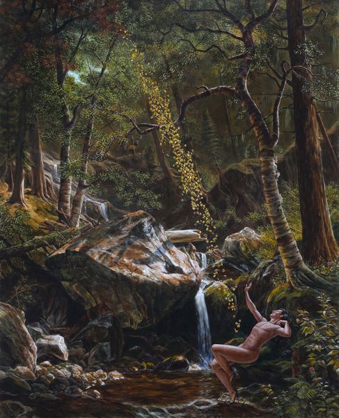 Curator: Oh, there's something wonderfully serene about Hermann Ottomar Herzog's "Sketching on Beaver's Creek", painted around 1885. Don't you think? Editor: Serene, yes, but also…a touch lonely? The deep greens are so enveloping. It's almost claustrophobic, yet then the sunlight breaks through… that shimmering, diffused light is lovely. Curator: Herzog captures that tension masterfully, doesn’t he? The darkness, a symbol of perhaps being alone in the wilderness, contrasted by glimmers of light—almost spiritual shafts. It speaks volumes about our relationship with nature, how we see ourselves reflected back. Editor: Absolutely. And that lone figure beneath the parasol—is that Herzog himself? Or a stand-in for any observer, trying to tame the wildness with a civilized tool like a parasol. Note how the parasol resembles mushroom or umbrella cloud… Curator: Fascinating point! I think the inclusion of the artist is key here. Is it nature as a muse, as a battle to subdue the landscape, or even more complicated? The stream, of course, is a common enough trope -- life's passage, the ever flowing present moment. Editor: The presence of a broken branch cutting across the stream makes me question life's trajectory and how fleeting these glimpses into wild spaces may be. Almost like an obstacle on your spiritual path. Is there danger lurking in paradise? Curator: Could it be, also, about human intervention? Is nature disrupted by the fallen limb? By the presence of that lone figure? Are we, in a sense, polluting the untouched landscape merely by observing it, by wanting to possess it? The ambiguity is thrilling. Editor: The painting also shows us how culture tames nature. We only access Beaver Creek under our umbrellas and painterly pursuits... The painting thus also reveals culture's limitations, the cultural mediation between ourselves and primal nature... Curator: So, while Herzog shows us a moment of beautiful light and pastoral setting, he presents something a bit darker. As beautiful as it is, one leaves feeling the solitude and transience of this natural snapshot. Editor: Exactly. Perhaps the painting captures that yearning for an unachievable oneness with something vast and untamed... It is melancholic and moving.