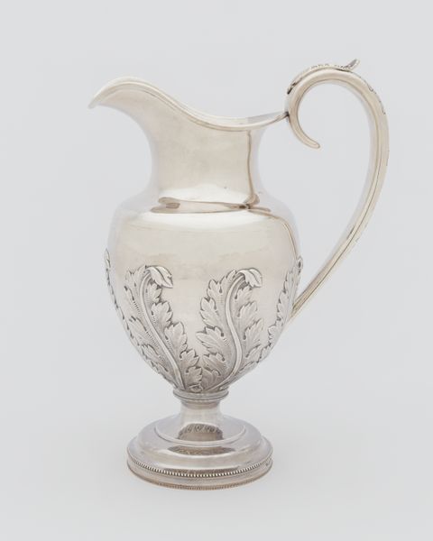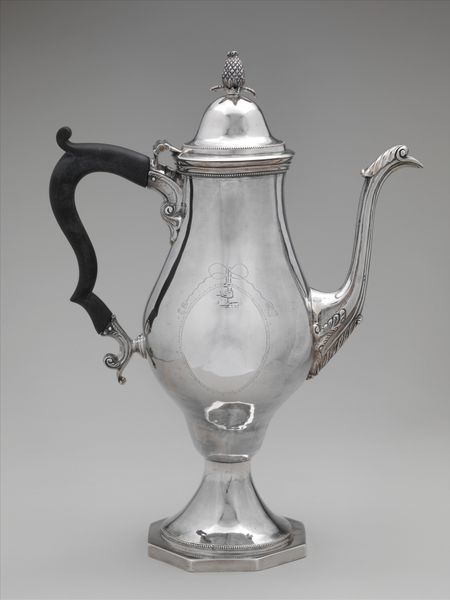 Curator: Here we have a late 18th-century wine decanter currently residing in the Metropolitan Museum of Art. My first impression is that this is all about elegant simplicity; a beautifully understated piece. What strikes you? Editor: I am fascinated by the socio-economic context of this wine decanter, specifically the labor that was needed to create it and its place within aristocratic life. The sleek form does belie its probable connection to extractive industry and silversmithing as an artisanal craft. Curator: True. While seemingly minimalist, its smooth, unbroken lines are very appealing. Consider the elegant curve of the handle against the bulbous body—a graceful dialogue between form and function. The proportions adhere to classical ideals, and it has these thin lines around the spherical body that emphasize its rotund shape. Editor: Exactly! Think about the social ritual surrounding its use – the act of pouring, the gathering of elites consuming. Also, silver itself became symbolic of prestige, connecting the aristocracy with natural resource exploitation. What meaning can we get from looking into this intersection of function and class distinction? Curator: Indeed, the choice of silver, beyond its lustrous aesthetic, signifies status. The reflective surface must have brilliantly caught the candlelight in aristocratic settings. And what about its Baroque-Rococo flair; an evolution towards asymmetry which this item hints at? It challenges a straightforward historical reading. Editor: Baroque and Rococo pieces signify opulence, with an overt display of wealth in aristocratic circles. We might see it as a rejection of older sensibilities through labor made to appear smooth. Its historical significance and beauty coexist through careful material selection to reflect society's desires. Curator: Very insightful. Its deceptively plain facade allows us to find a new appreciation for design which does not reveal immediately the social context from which it derives. Thank you. Editor: Indeed. Looking at the wine decanter helps to expose wealth as related to material practices in the olden days.